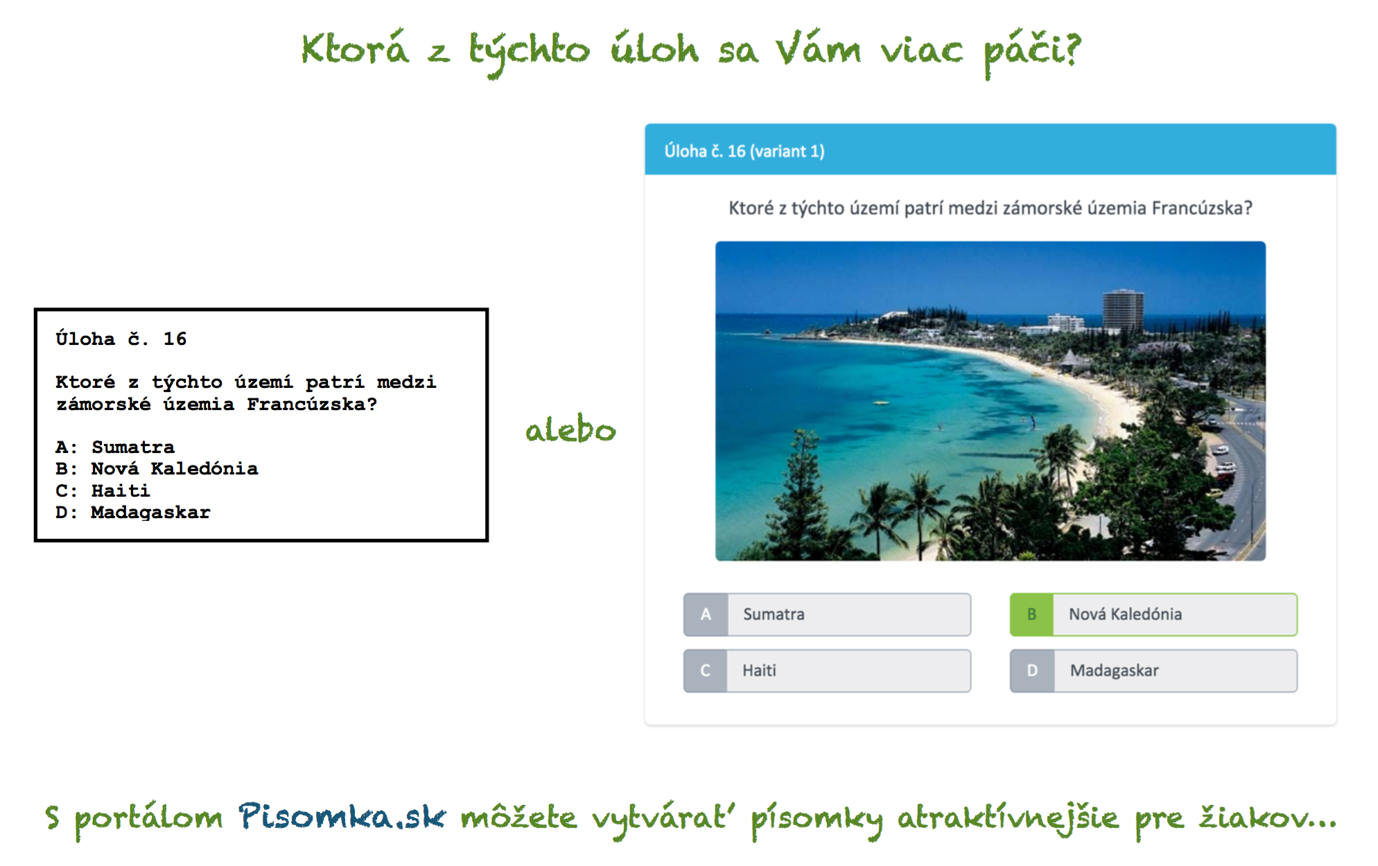Pisomka.sk je bezplatný webový portál pre učiteľov na vytváranie, používanie a zdieľanie elektronických písomiek, ale aj testov, domácich úloh atď. Žiaci riešia tieto písomky pomocou tabletov, počítačov, prípadne mobilných telefónov. Jedným zo základných princípov portálu je jednoduchosť, učiteľ sa zaregistruje (je možné aj cez Facebook) a okamžite môže začať vytvárať písomku (prípadne si stiahnuť už hotovú zdieľanú písomku a dať ju žiakom, prípadne predtým upraviť). Pri vytváraní zadá iba otázku a 4 možnosti (prípadne obrázok), nemusí nič nastavovať, nič ho nezdržuje.