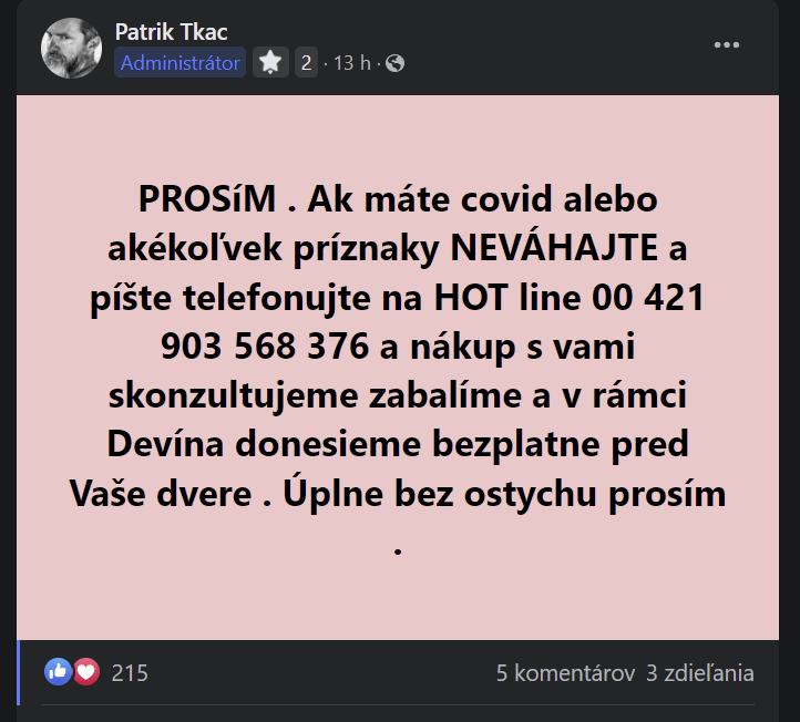 - Devínčanom, ktorí majú Covid, stačí zavolať na horúcu linku tamojšieho obchodu