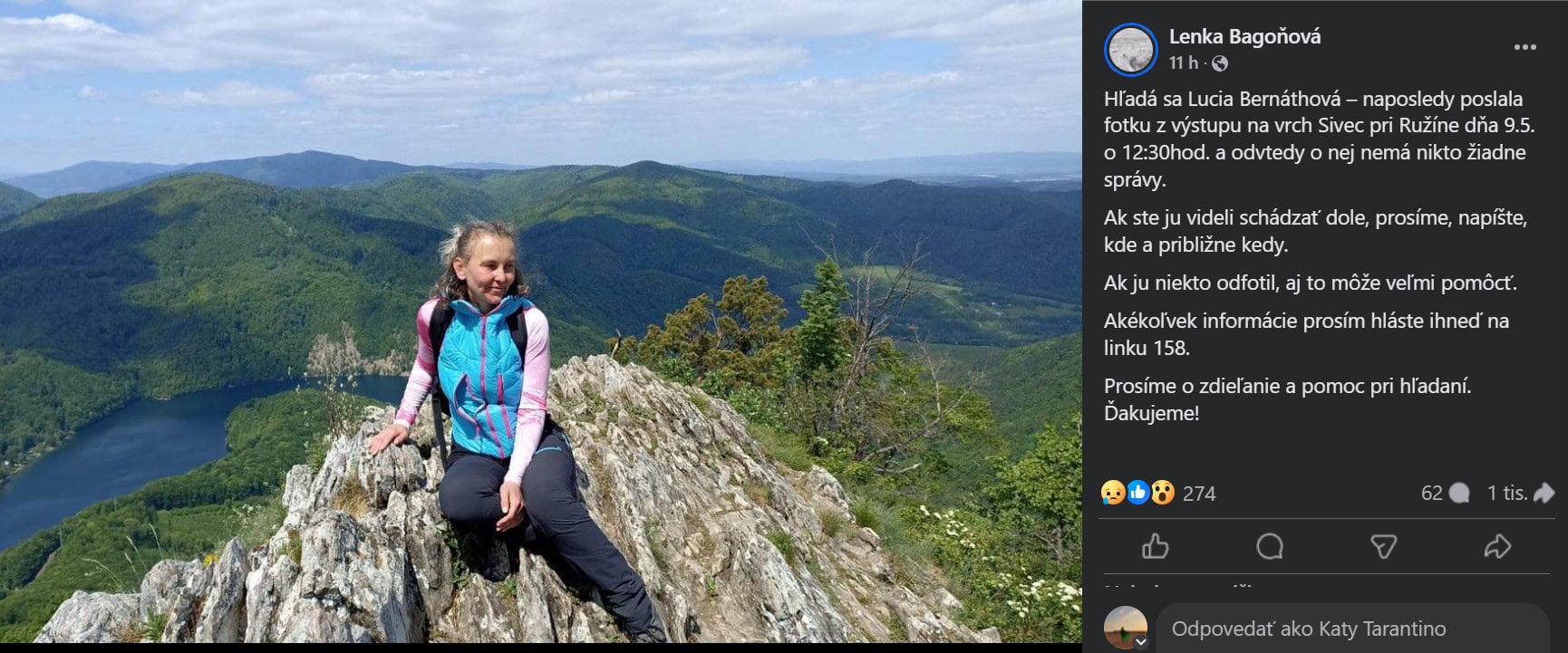 Príbuzní a rodina hľadajú cez sociálne siete svoju známu Luciu Bernáthovú. Poslednú fotografiu pridala zo svojho výstupu na vrch Sivec v Ružíne dňa 9. mája o 12:300 a odvtedy sa neohlasuje.