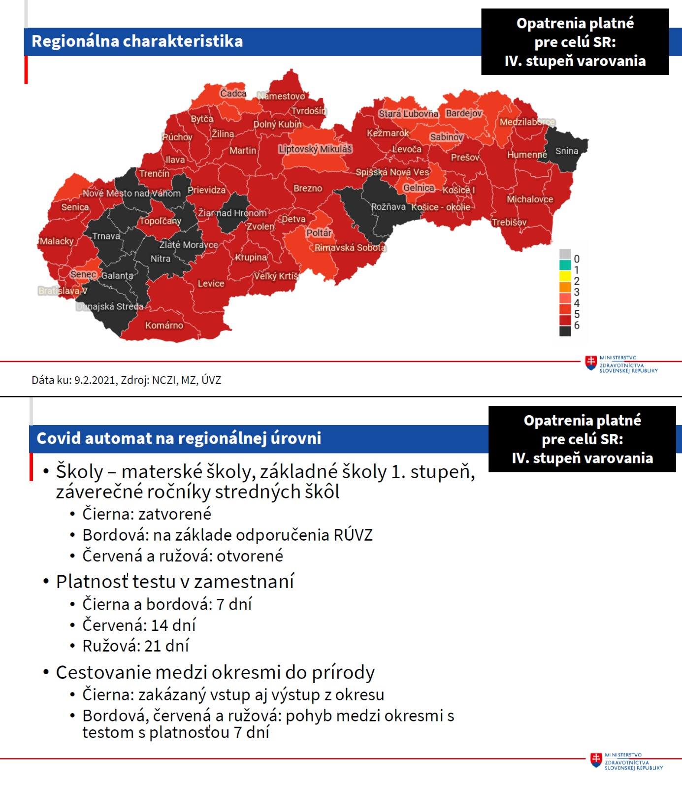 Takto vyhodnotením epidemiologickej situácie boli okresy rozdelené do farebných fáz a na základe covid automatu v nich od pondelka 15. februára platí nasledovné. Potvrdenie o negatívnom teste na ochorenie COVID-19 (PCR alebo antigénový test), ktoré nie je staršie ako sedem dní, pre výnimky napr. do práce, je potrebné od pondelka vo všetkých okresoch okrem 13tich, ktoré sú bordové – zaradené v II. stupni varovania.