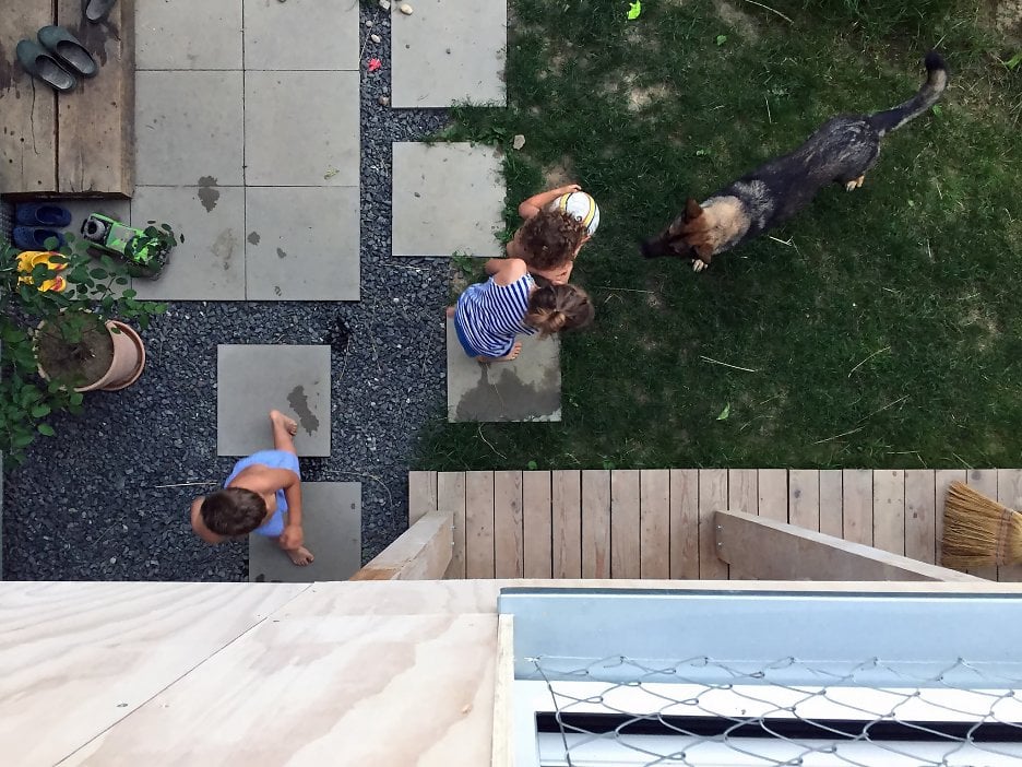 - Detské krídlo “vo vzduchu” ponecháva záhradu plynúť naprieč svahom.