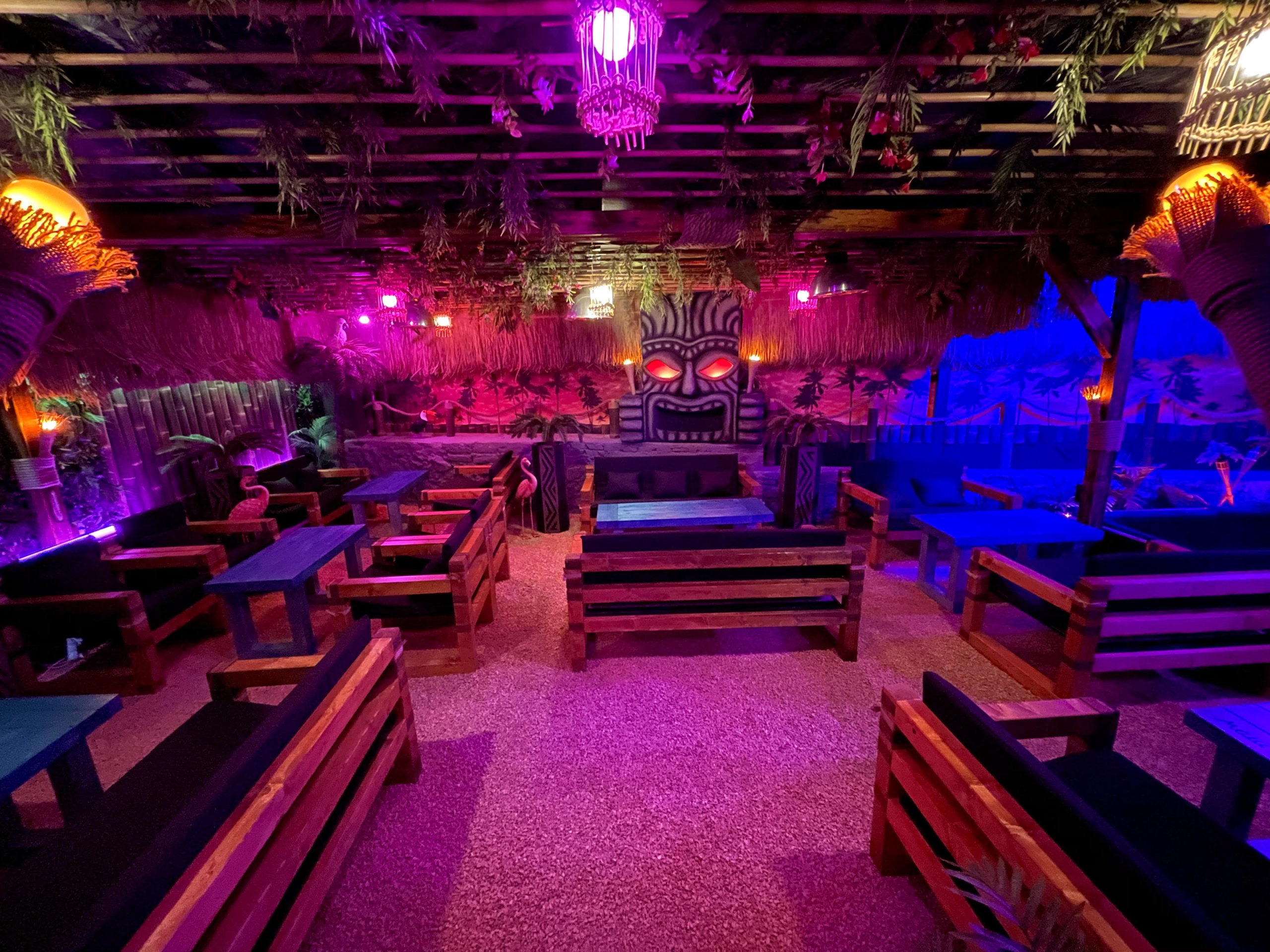 Ešte aj dnes má kvôli tomu zničené prsty, keďže flambovacou pištoľou opaľoval drevené sedenie, aby vyzeralo viac autenticky. Okrem toho, každý stôl má zvrchu vypálený názov nejakého tropického ostrova. Lukášov obľúbený je Tahiti, z ktorého má dobrý výhľad na celú terasu a nad hlavou mu visí mláďa šimpanza. „Takto to asi znie divne, ale keď prídete, pochopíte.“