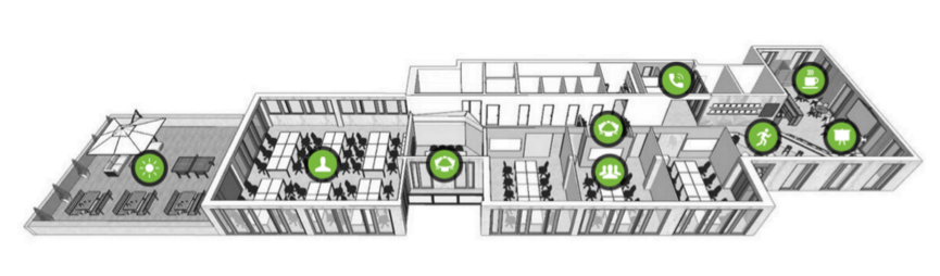 Všetci členovia budú mať k dispozícií okrem iného dennú šálku kávy zdarma v kaviarni, kde budeš môcť mať meeting či pokecať so svojimi kolegami. Okrem toho tu budú skype búdky na vybavenie hovorov a terasa, kde počas pekných dní budeš môcť relaxovať či hrať ping-pong. Tvoje pracovné dni už nikdy nebudú ako predtým!