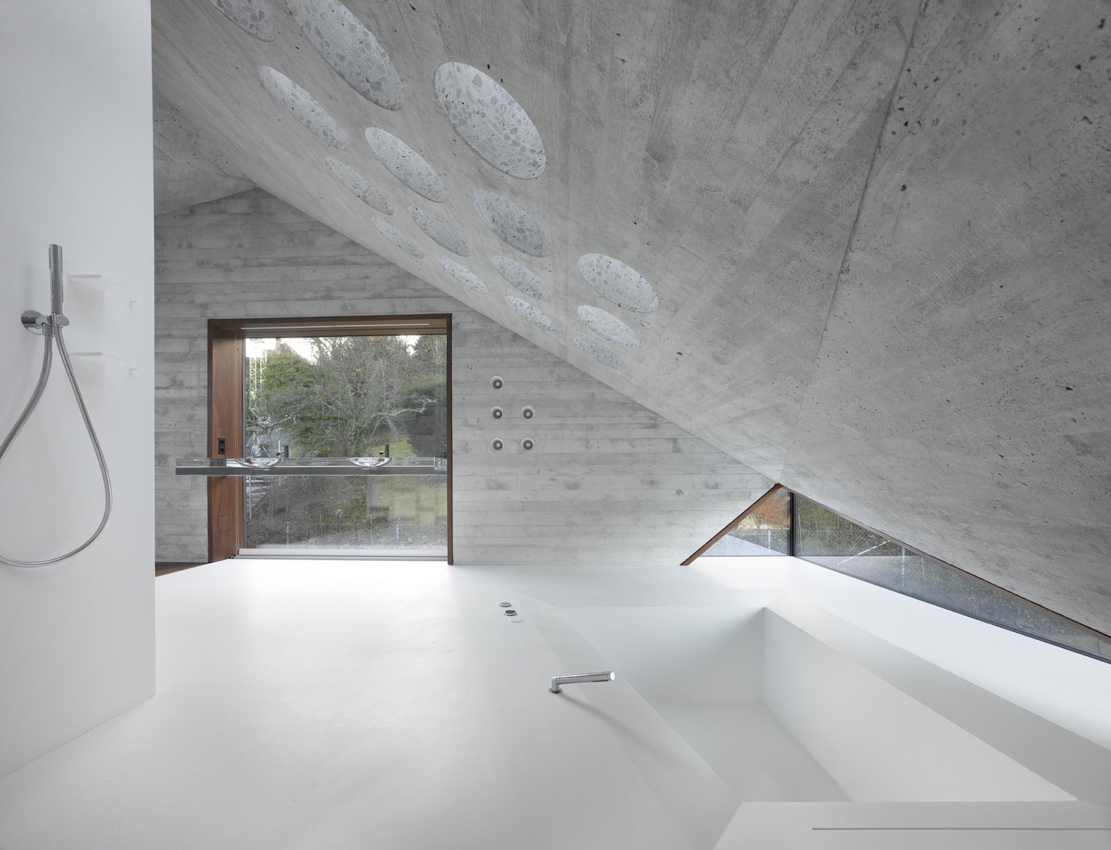 Aby ale stavba nepôsobila celkom betónovo, architekti sa rozhodli trochu pohrať so strechou budovy, a tak vznikol výsledný efekt v podobe trojuholníka a zaujímavo vytvarované sú aj steny s oválnymi výrezmi. Ak sa pýtaš na veľký, na prvý pohľad nevyužitý, priestor na oboch stenách, aj toto rozhodnutie malo svoje opodstatnenie. Takto monoliticky zložená schránka spájajúca dve steny totiž kombinuje izoláciu a technickú inštaláciu stavby.