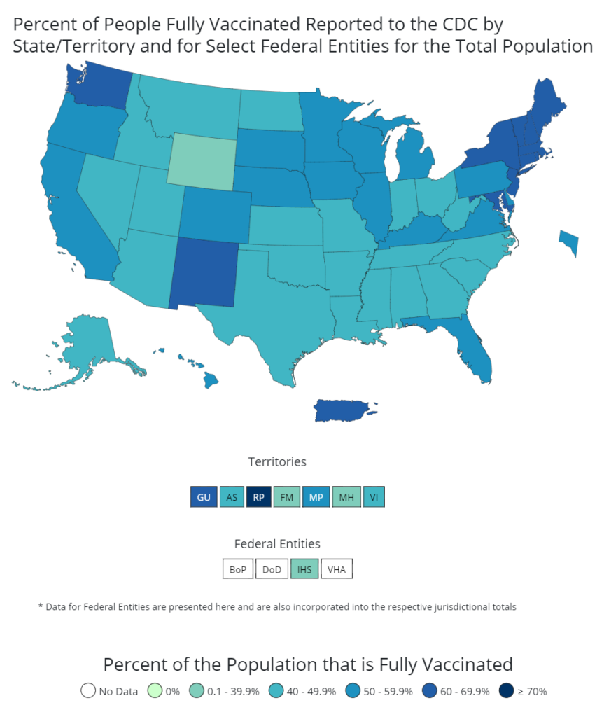 Podľa dát Centra pre kontrolu a prevenciu chorôb (CDC) patrí Alabama k najmenej zaočkovaným štátom v USA. Najmenej plne zaočkovaných má Wyoming (39,9 %) Idaho (40,2 %), Západná Virgínia (40 %), Alabama (40,4 %) a Mississippi (40,8 %).