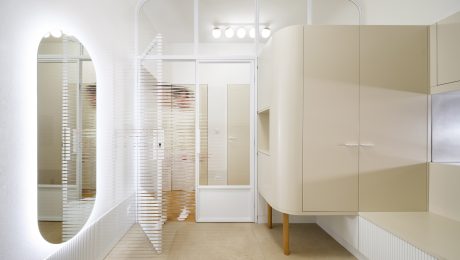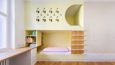 Pre pocit intimity a hygienickú kvalitu sa byt od schodiskovej podesty oddelil vstupnou halou, ktorú architekti otvorili dennému svetlu cez kuchyňu a veľkorysú presklenú stenu. Deti dostali svoje izby orientované do tichého dvora, zatiaľ čo rodičia majú spálňu a pracovný kútik situovaný smerom do ulice.