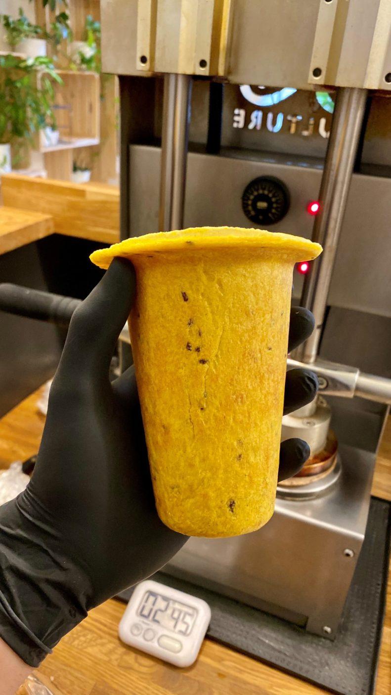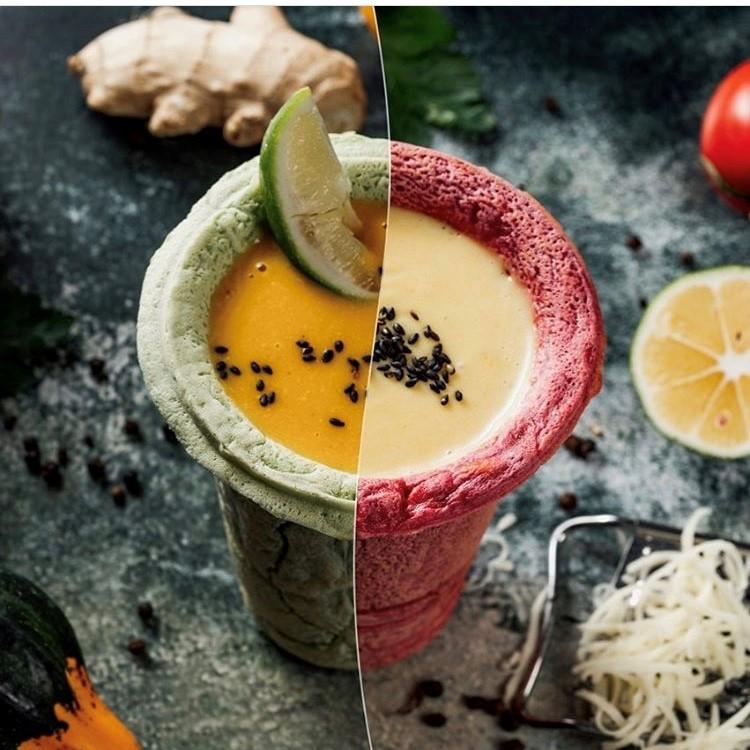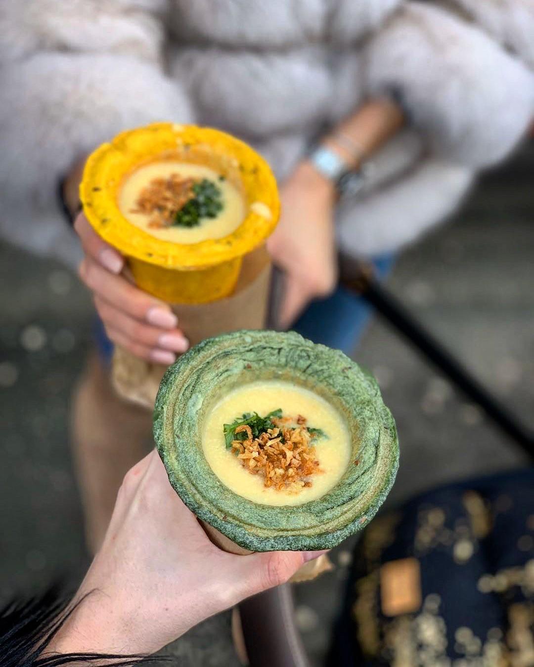 Sú z múky, vody, čierneho korenia a ďalších korením, ktoré im dodávajú farbu ako kurkuma, cvikla, spirulina. Taniere nemáme vôbec. Jediné, čo v rámci možností a nutnosti používame, sú ekologické kelímky na donášku alebo keď potrebujete polievku zobrať so sebou. Kornútky opekáme priamo pred zákazníkom na špeciálnom stroji, ktorý je patentovaný a vyrába sa iba pre Soupculture.