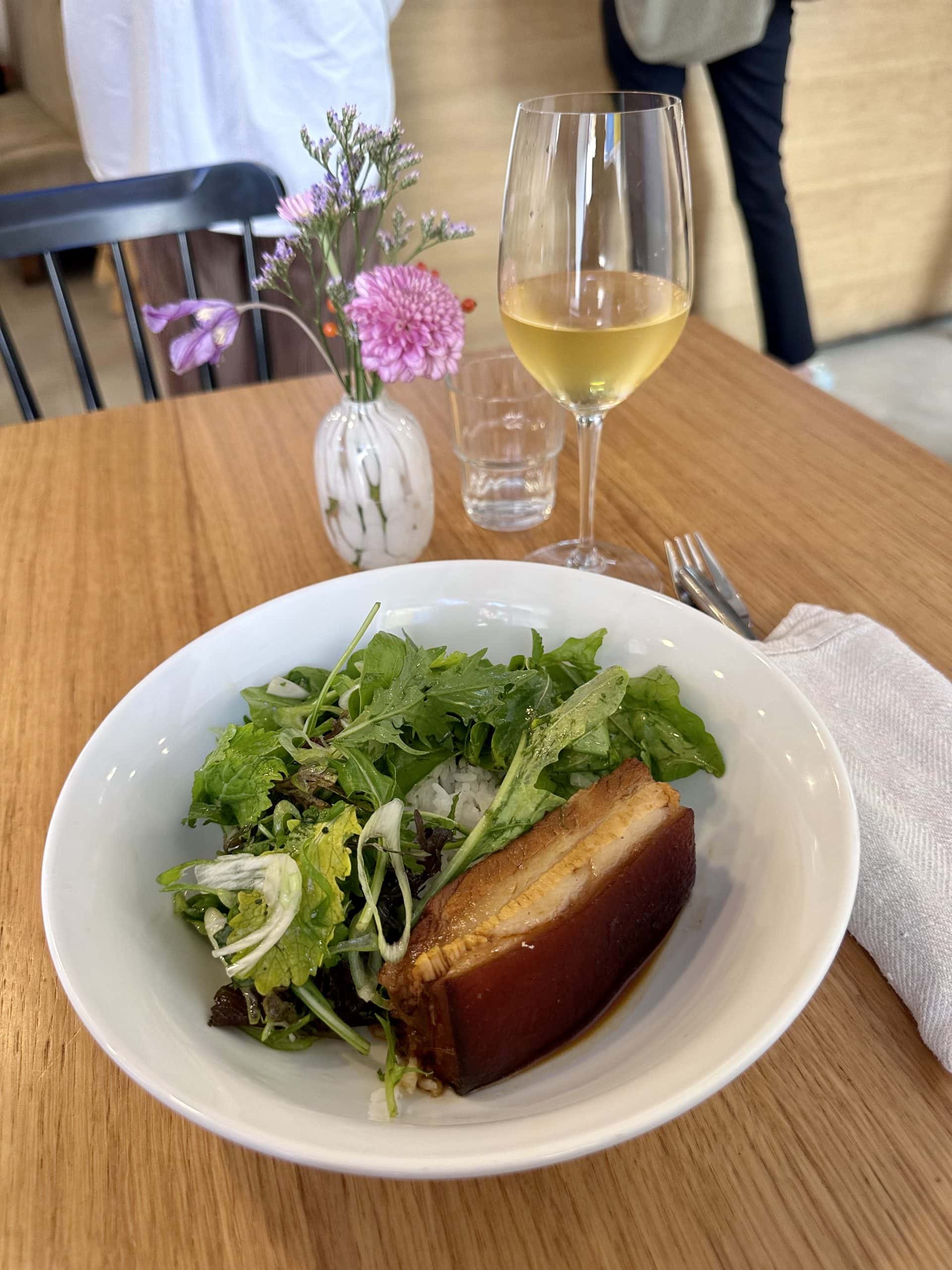 Polievka silná s obrovským množstvom vajíčka z tuku. To ma katapultovalo späť v čase v tom najlepšom slova zmysle. Bôčik bol absolútne jemný a explodoval chuťami. Nasladlosť od „Korean style“ omáčky, výborná ryža a skvelý šalát z bylín od farmára. Zábavný lokálny obed šmrncnutý Áziou.