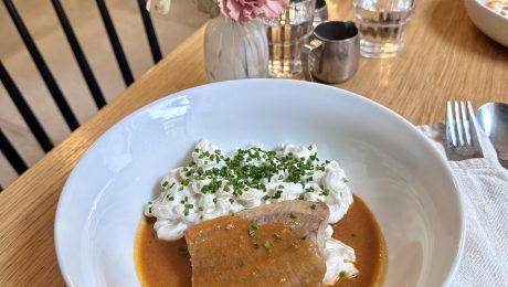 Alebo sendvič s burratou a grilovaným portobelom na opečenom kváskovom chlebe. Spolu s fritovaným pórom to bolo jedlo, ktoré by v momente mohlo ísť ako vege možnosť na brunch menu. A dokonca aj moja „obľúbená“ balsamico redukcia v kombinácii s bylinkovým olejom sem pasovala ako zadok na šerbeľ.