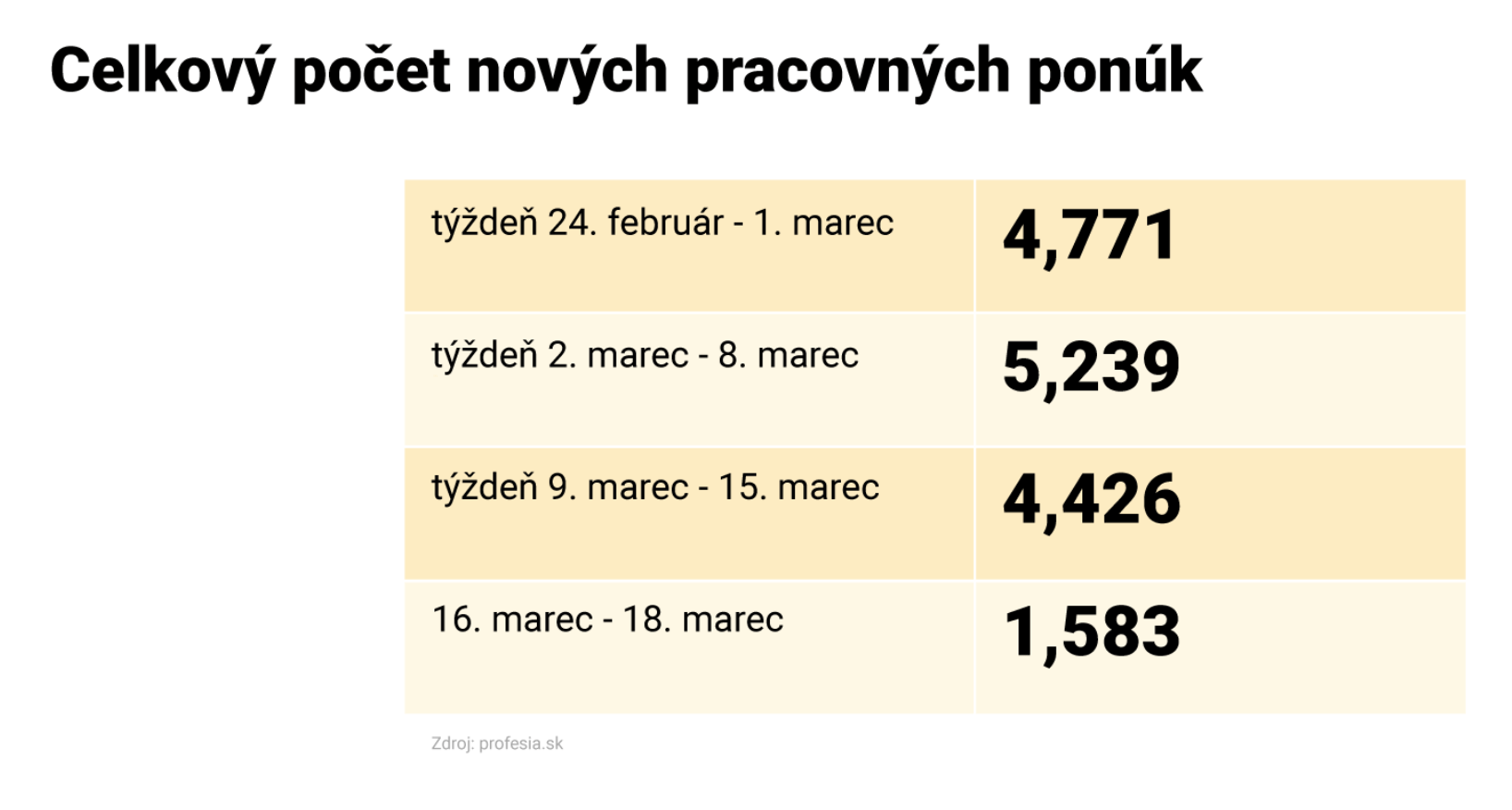 „Minulý týždeň zaznamenali na našom portáli 1865 novým pracovných ponúk. Ak to porovnáme s rovnakým obdobím v roku 2019, ide o výrazný prepad. Vtedy bolo tých ponúk 5019. Výrazný pokles sme začali registrovať od 12. týždňa tohto roka,“ prezradila pre Startitup Nikola Richterová z Profesia.sk