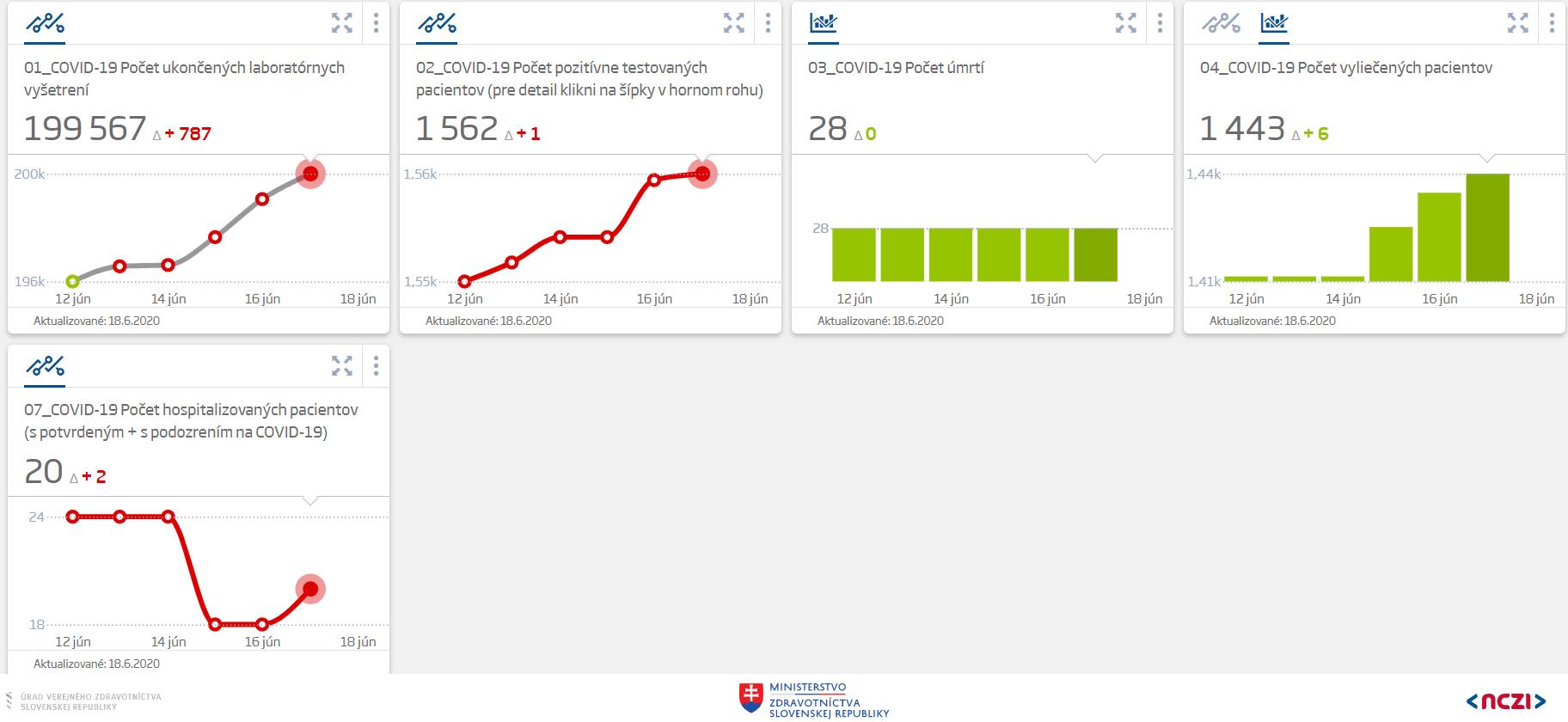 Ako informoval permanentný krízový štáb na korona.gov.sk, hospitalizovaných je 20 pacientov. Z tohto počtu u dvoch pacientov bolo ochorenie Covid-19 potvrdené. Nikto nie je na jednotke intenzívnej starostlivosti ani umelej pľúcnej ventilácii. Kĺzavý medián zostáva na hodnote tri. Jeden nový prípad zaznamenali v okrese Revúca.