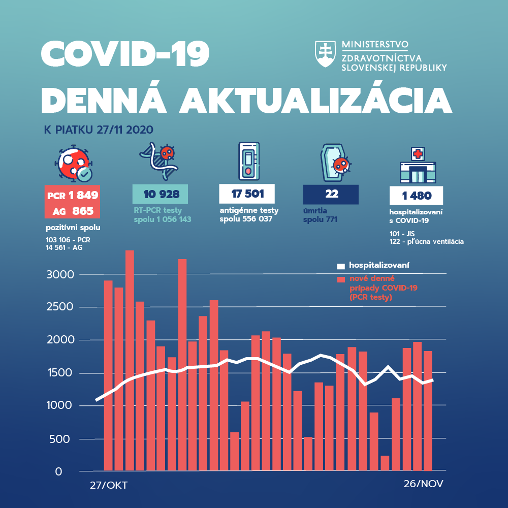 Na Slovensku vo štvrtok 26. novembra pribudlo 1 849 nových prípadov koronavírusu. Celkový počet prípadov na Slovesku dosiahol 103 106. Laboratóriá vyhodnotili doposiaľ 1 056 143 PCR testov. Pribudlo 22 nových úmrtí. Celkovo si koronavírus vyžiadal na Slovensku už 771 životov.