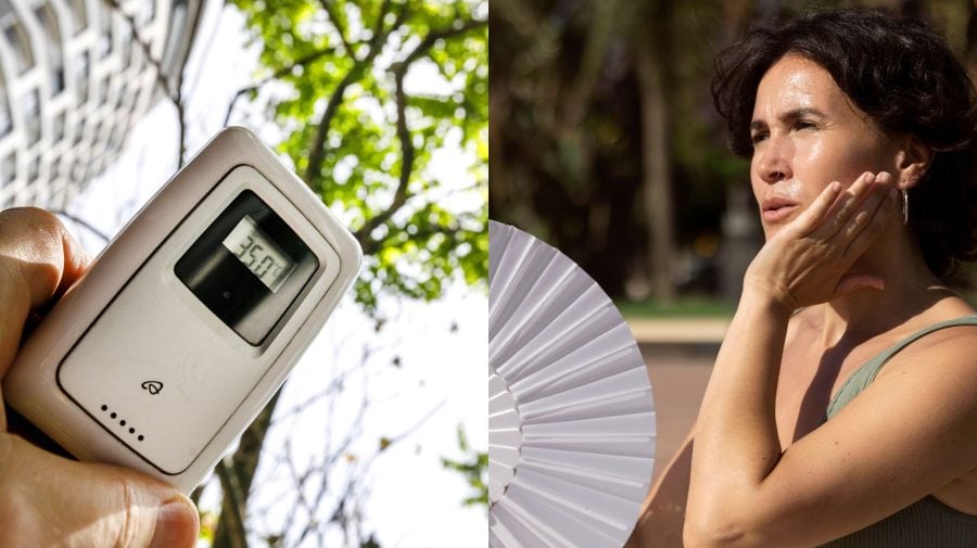 Teplomer a žena sa ovieva vejárom.