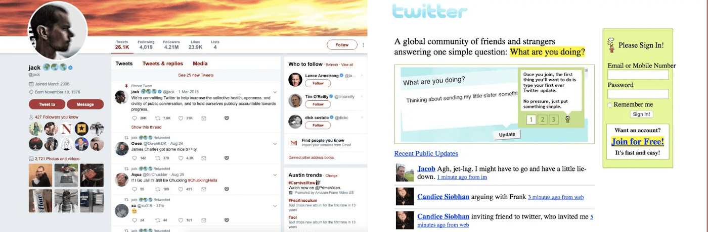 Twitter pochádza od študentov z New York University. Jeden z nich, Jack Dorsey, ostatným predstavil nápad špeciálnej online SMS správy, ktorá by sa zobrazovala iba určitým ľuďom. Časom vznikli návrhy dizajnu a prišiel aj prvý názov twttr. Vynechávanie samohlások z názvov bolo v tom čase trendom a doména twitter.com aj tak nebola dostupná nasledujúceho pol roka.