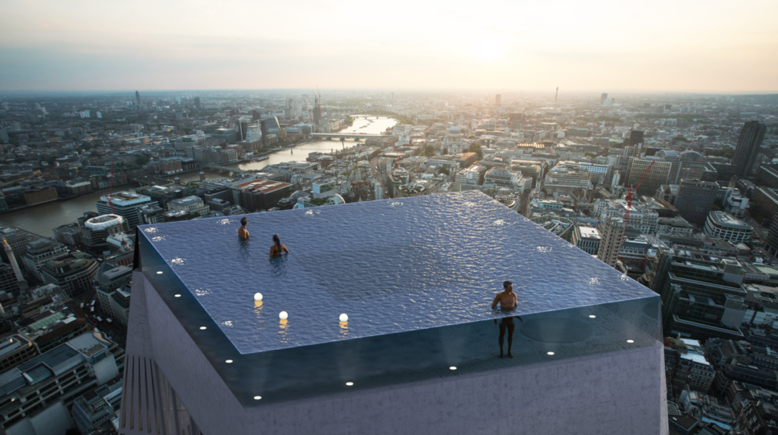 Unikátny 600 000 litrový bazén by sa mal nachádzať vo výške 200 metrov na streche 55 poschodového mrakodrapu Infinity London a vďaka neobmedzenému výhľadu a infinity dizajnu by sa mal stať absolútnym svetovým unikátom, informuje CNN.com. Vyrobený bude z liateho akrylu a boky rovnako ako aj dno budú priehľadné, čo umožní návštevníkom budovy nad ich hlavami vidieť plavcov v kontraste oblohy.
