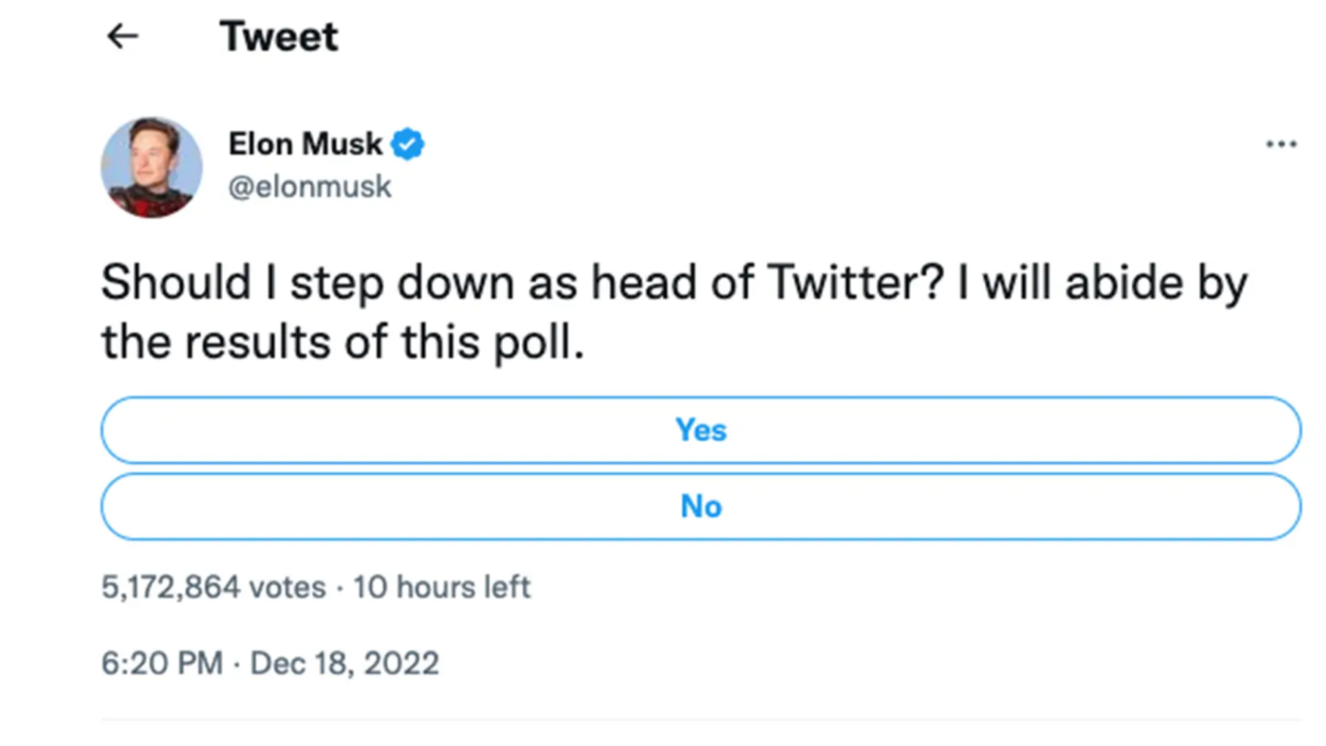 Elon Musk spustil online anketu, v ktorej sa používateľov pýta, či by mal odstúpiť z funkcie generálneho riaditeľa Twitteru. V ankete napísal: „Mám odstúpiť z funkcie šéfa Twitteru? Budem dodržiavať výsledky tohto prieskumu.“