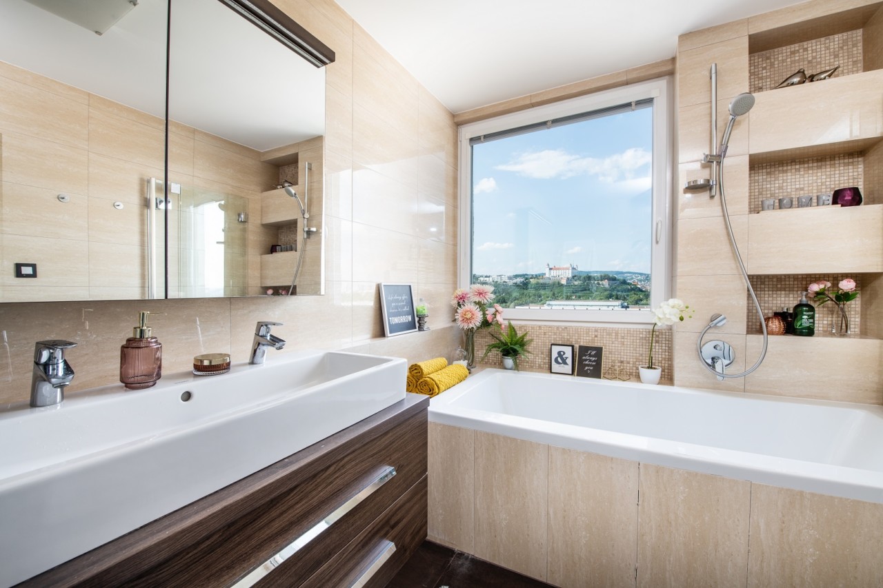 „Neradi sa opakujeme s tým výhľadom, ale nedá nám zamlčať, že musí byť úžasné kúpať sa, piť vo vani prosecco a zamyslene hľadieť na hrad,“ povedali o byte makléri realitnej kancelárie Arvin & Benet.