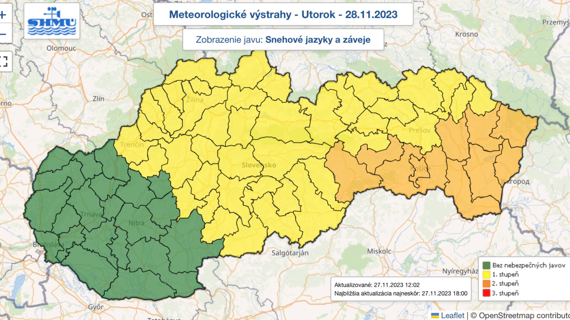 Výstraha 1. stupňa pred snežením bude platiť v okresoch Žiar nad Hronom, Banská Štiavnica, Krupina, Veľký Krtíš, Zvolen, Banská Bystrica, Detva, Lučenec, Poltár, Brezno, Rimavská Sobota, Revúca, Rožňava, Gelnica, Košice a okolie, Bardejov, Prešov, Svidník, Stropkov, Medzilaborce, Vranov nad Topľou, Trebišov, Michalovce a Sobrance.