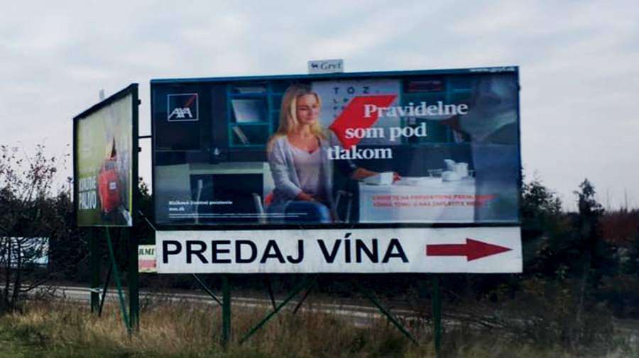Zobraziť celú galériu (2)Do očí ako prvý udrie nápis predaj vína, ktorý je doplnený červenou šípočkou určujúcou smer. Nad ním je o dosť väčší bibord s nápisom „Pravidelne som pod tlakom“. Na prvý pohľad spolu možno tieto dve reklamy súvisia, dôsledný pozorovateľ však po čase pochopí, že to tak nie je. Bilbord je totiž s vínom absolútne nezainteresovaný a odkazuje na poisťovňu Axa.