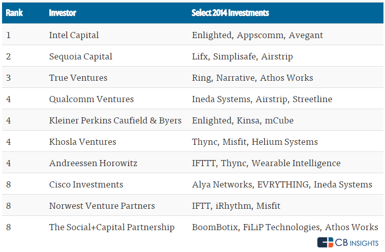 Intel Capital kraľuje tomuto zoznamu vďaka jedinečným dealom v roku 2014, za nimi nasleduje dobre známa Sequoia Capital a True Ventures. Ako môžete vidieť nižšie, prominentní IoT investori sú nie len technologické firmy ako Intel, Qualcomm a Cisco, ale aj VC spoločnosti ako Khosla Ventures a Kleiner Perkins Caufield & Byers, ktoré v tento rok uskutočnili exit u Nest Labs a Dropcam.
