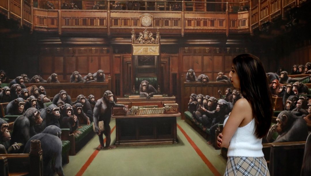 Brexit je nezvratný proces a tak sa pomaly dostávame do momentu, kedy sú rokovania v dvoch britských snemovniam vášnivé. Práve tak, ako šimpanzy z Banksyho obrazu. Pôvodný zámer autora bol však iný. Šlo o parlamentné debaty v susedných častiach Spojeného kráľovstva. Obraz má veľkosť viac ako 4 metre a ide o Banksyho najrozmernejšie dielo.