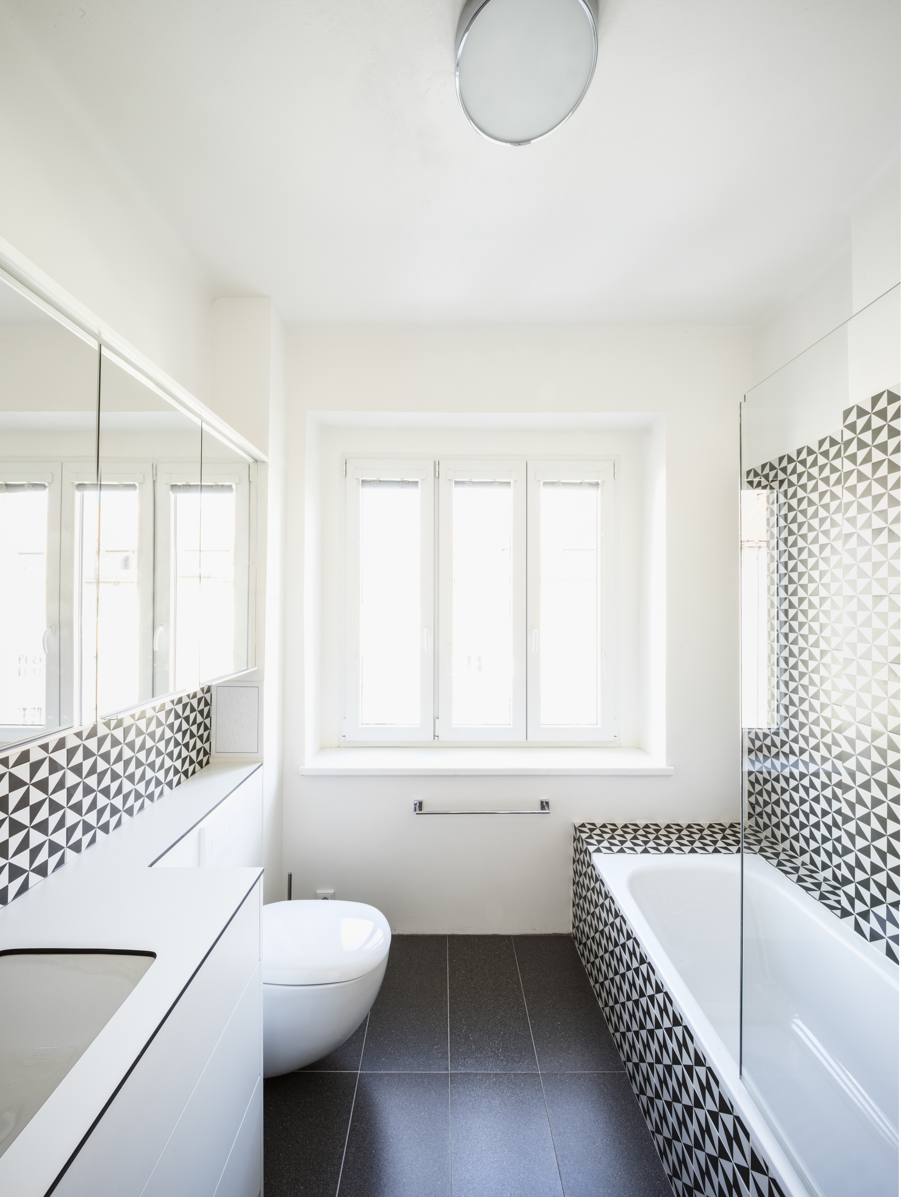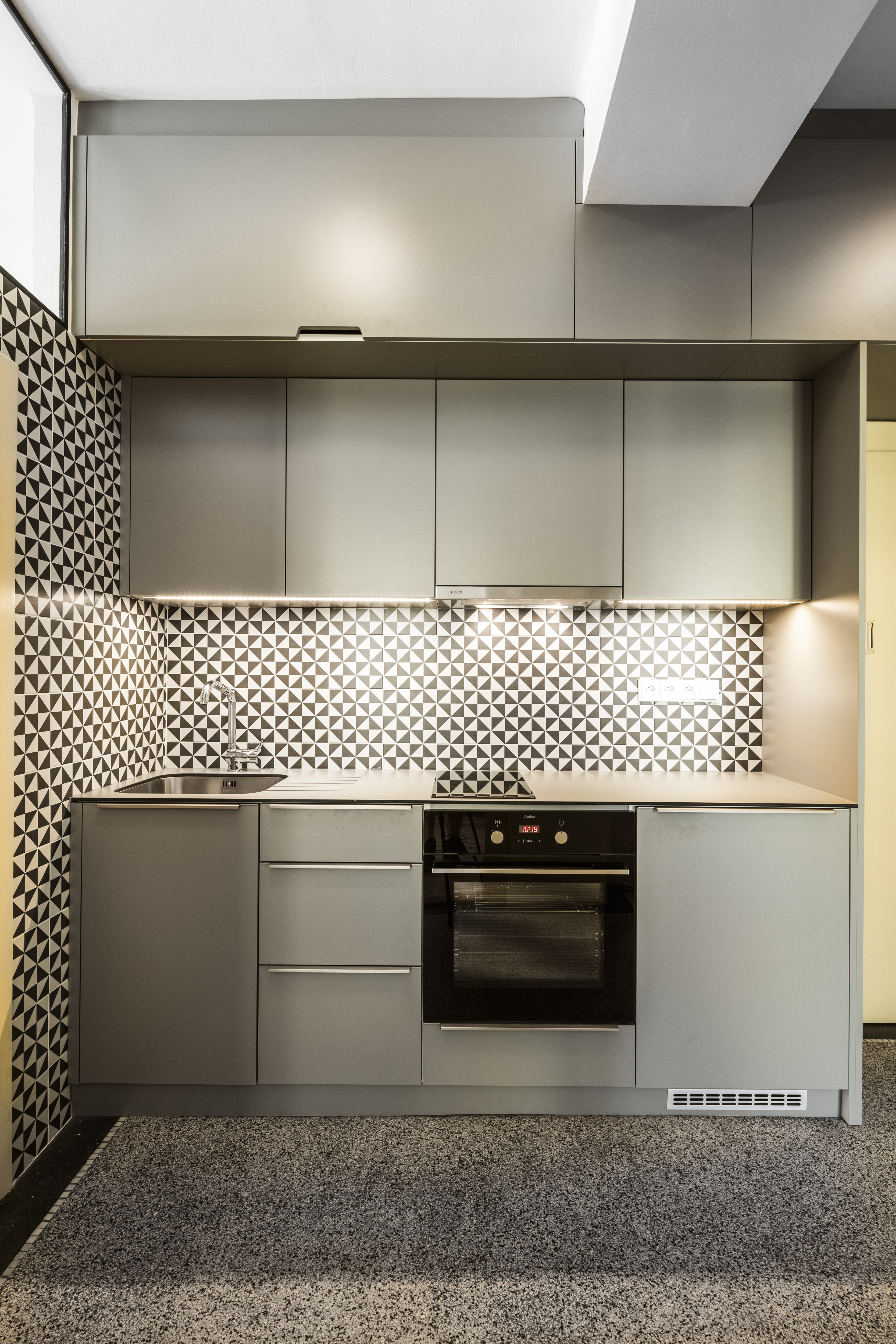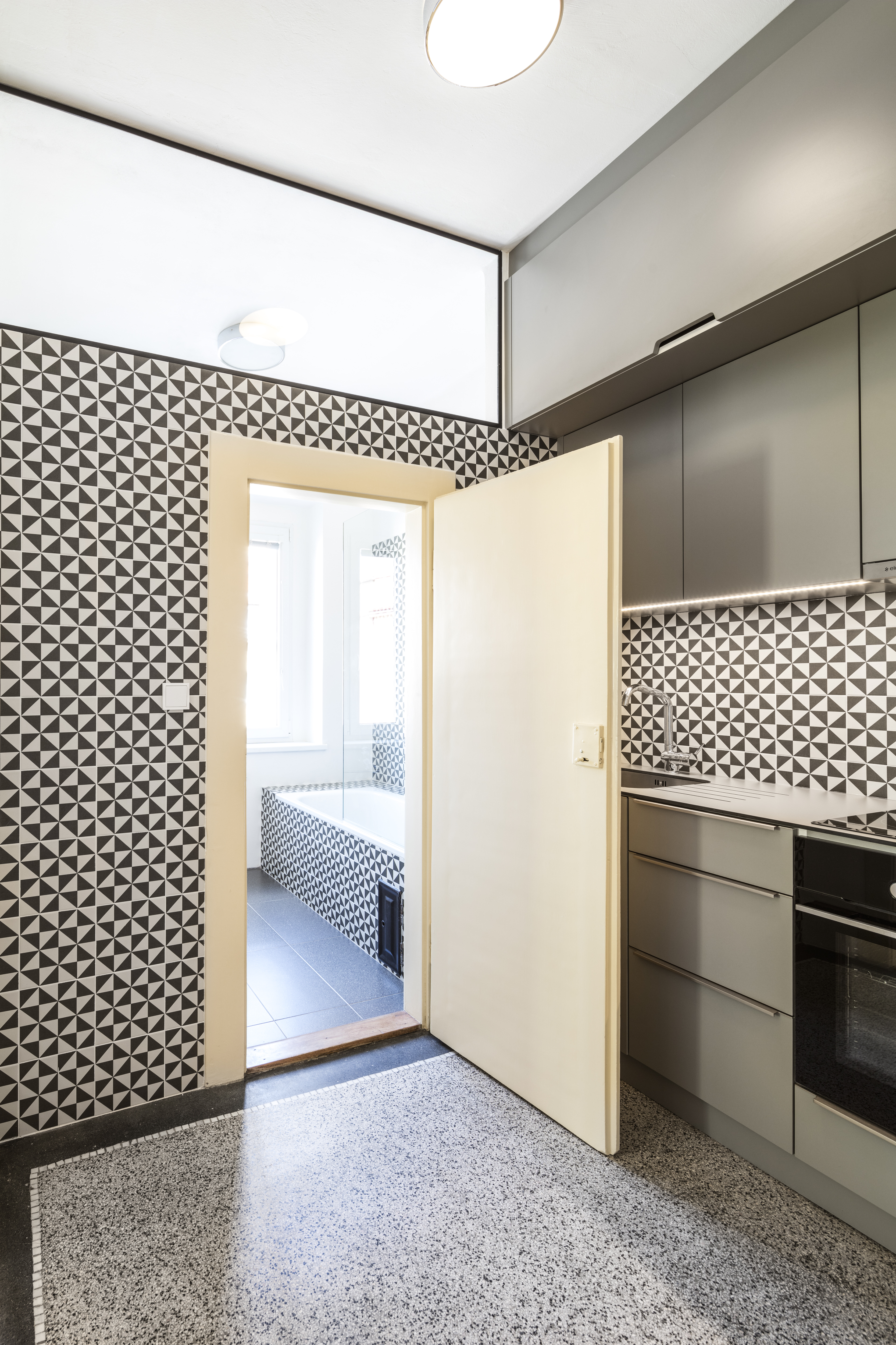Byt dostal súčasný výraz aj vďaka obkladu, ktorý architekti použili okolo kuchynskej linky a v kúpeľni.
