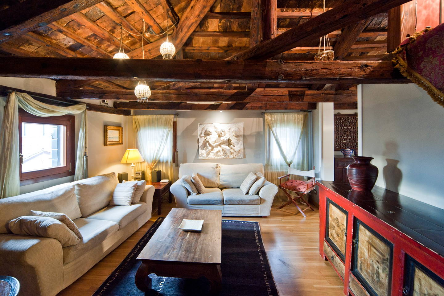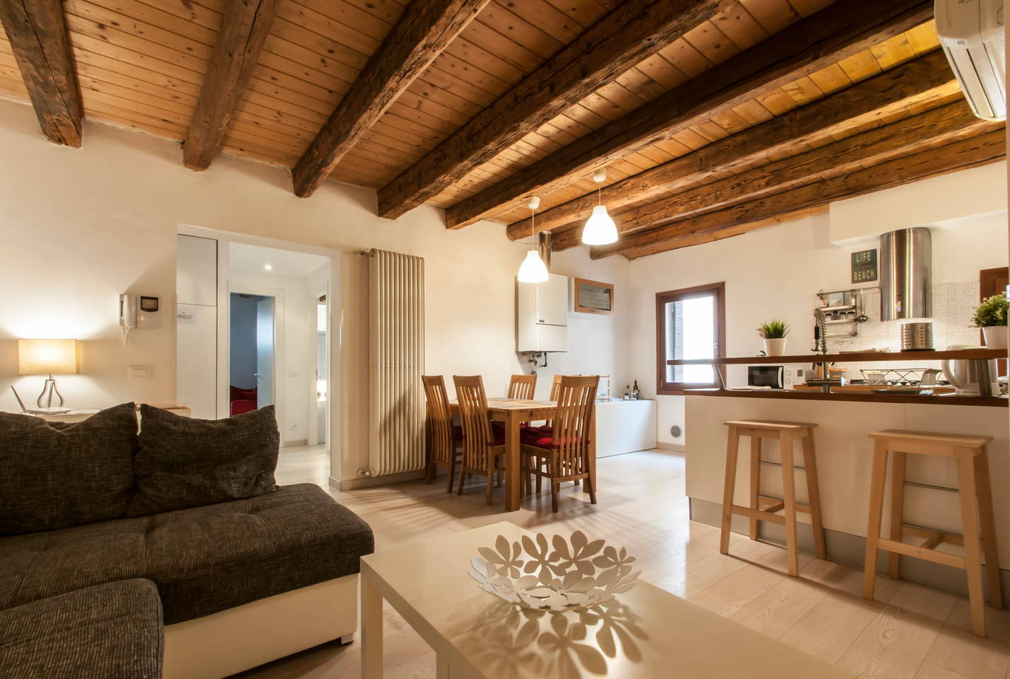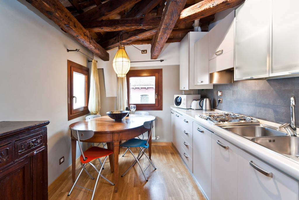 Podkrovný byt v centre Benátok, je odlišný najmä dreveným nábytkom, absolútne iným štýlom a zaujímavou izbou v podkroví. Byt si môžeš pozrieť tu