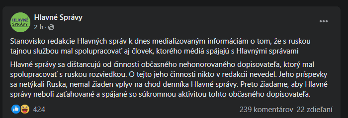 - Redakcia Hlavných správ sa od medializovaných informácií dištancuje. Tvrdia, že šlo o občasného prispievateľa, ktorý nedostával plat
