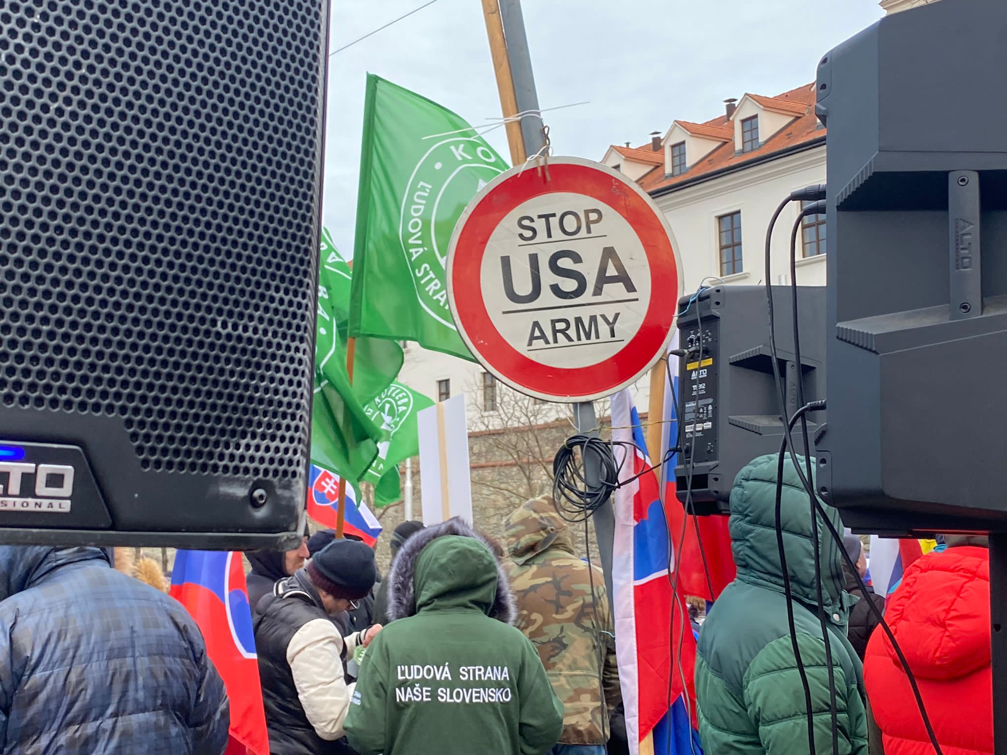 Účastníkov na protesty pred budovou NR SR zvolávali viaceré strany, napríklad SMER-SD, Republika či ĽSNS. Dav skanduje slová „vylezte“, viacerí z nich majú pútače, na ktorých sú vyzobrazené heslá „STOP USA Army“.