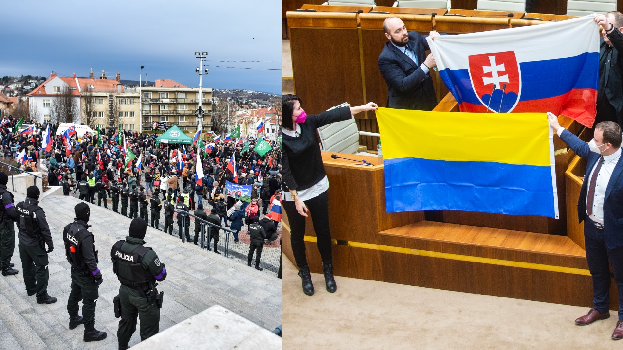 Pred Medveckého a Krupu sa neskôr postavali poslanci NR SR Janka Bittó Cigániková a Miroslav Žiak (SaS), ktorí zdvihli ukrajinskú vlajku. Tú Medvecký a Krupa obliali. Obliali aj poslanca Žiaka.