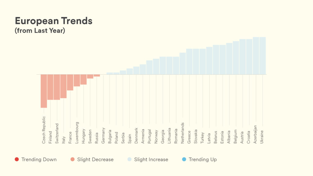 Celkový trend v Európe je, že znalosť angličtiny je buď stabilná, alebo stále rastie. Napredujú aj obyvatelia Centrálnej a Východnej Ázie. Najčastejšie sa s nízkou mierou angličtiny stretávame u pracovníkov vo vzdelávacom sektore, zdravotníctve a štátnej správe.