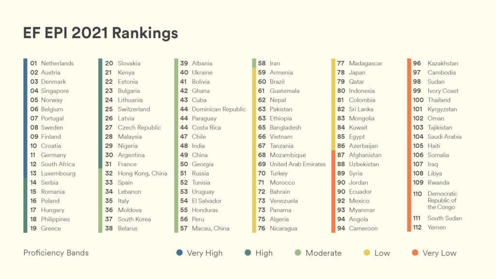 Spoločnosť Education First sa každoročne zameriava na prieskum anglického jazyka v 112 krajinách, v ktorých angličtina nie je materský jazyk. Tento rok sa do testovania zapojilo 2,2 milióna ľudí. S angličtinou tento rok prekvapivo bodovali aj Slováci, ktorí oproti minulému roku v rebríčku poskočili o päť miest.