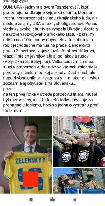 Práve to je aj jeden z najčastejších argumentov pro-ruského obhajovania Slovákov na sociálnych sieťach – Ukrajinci sú fašisti. K tomu treba prihodiť už roky starú a stále opakujúcu sa fotku skupinky ukrajinských vojakov, kde je na jednej z vlajok hákový kríž a netreba zabudnúť vynechať ani vyše 60 rokov mŕtveho kontroverzného Stepana Banderu.