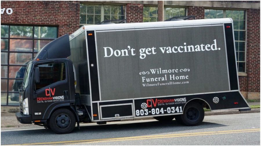 „Nedajte sa zaočkovať,“ mohli si prečítať fanúšikovia sledujúci futbalový zápas v meste Charlotte (Severná Karolína). Čierna dodávka, na ktorej bola uverejnená reklama uvádzala, že tento slogan si objednalo pohrebníctvo Wilmore Funeral Home.