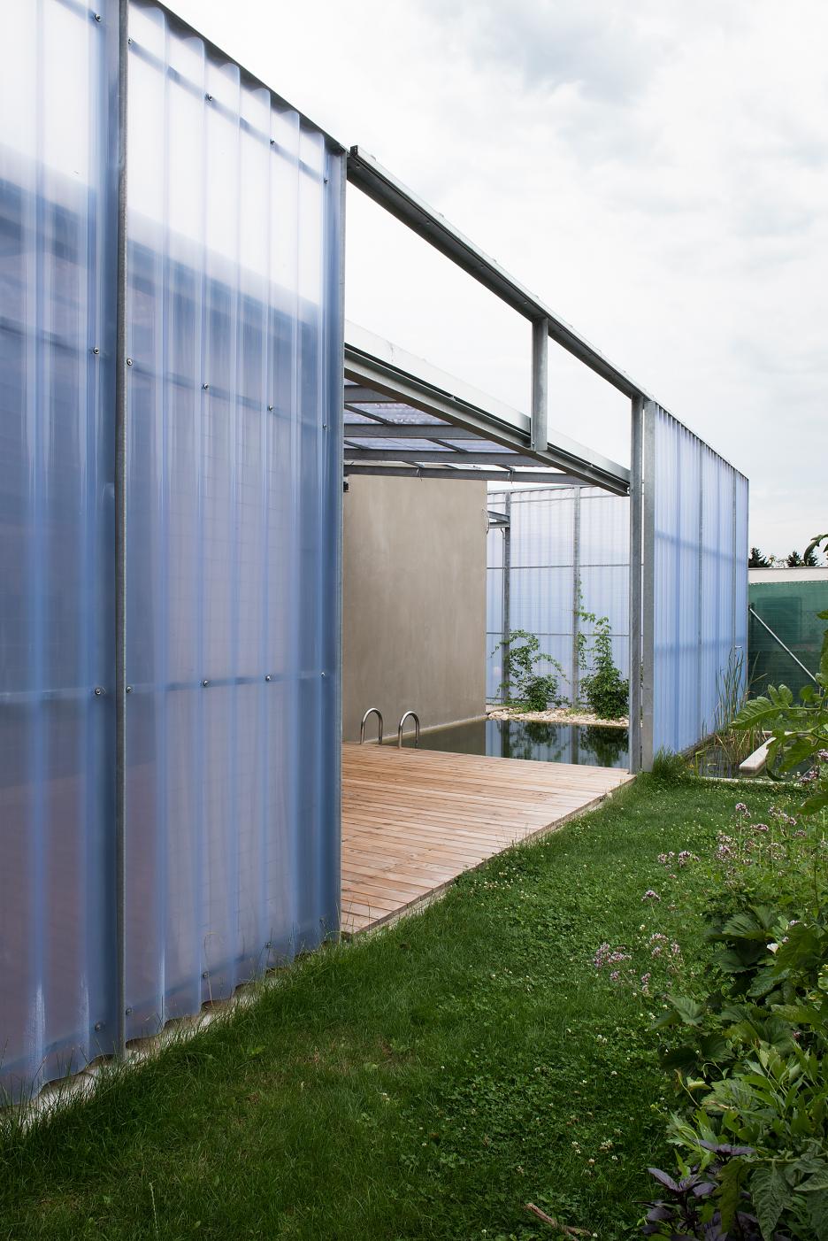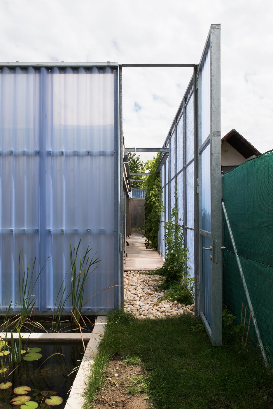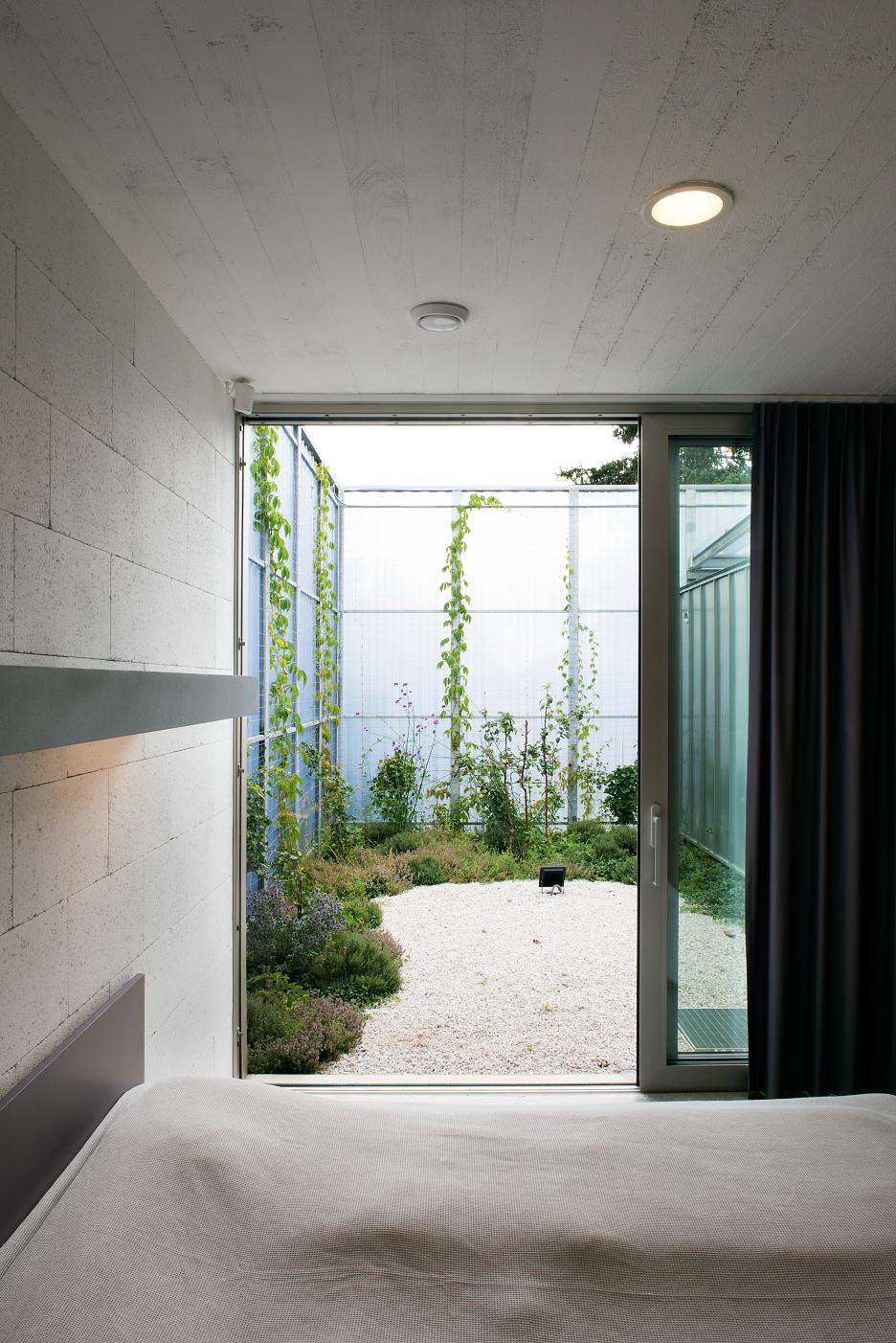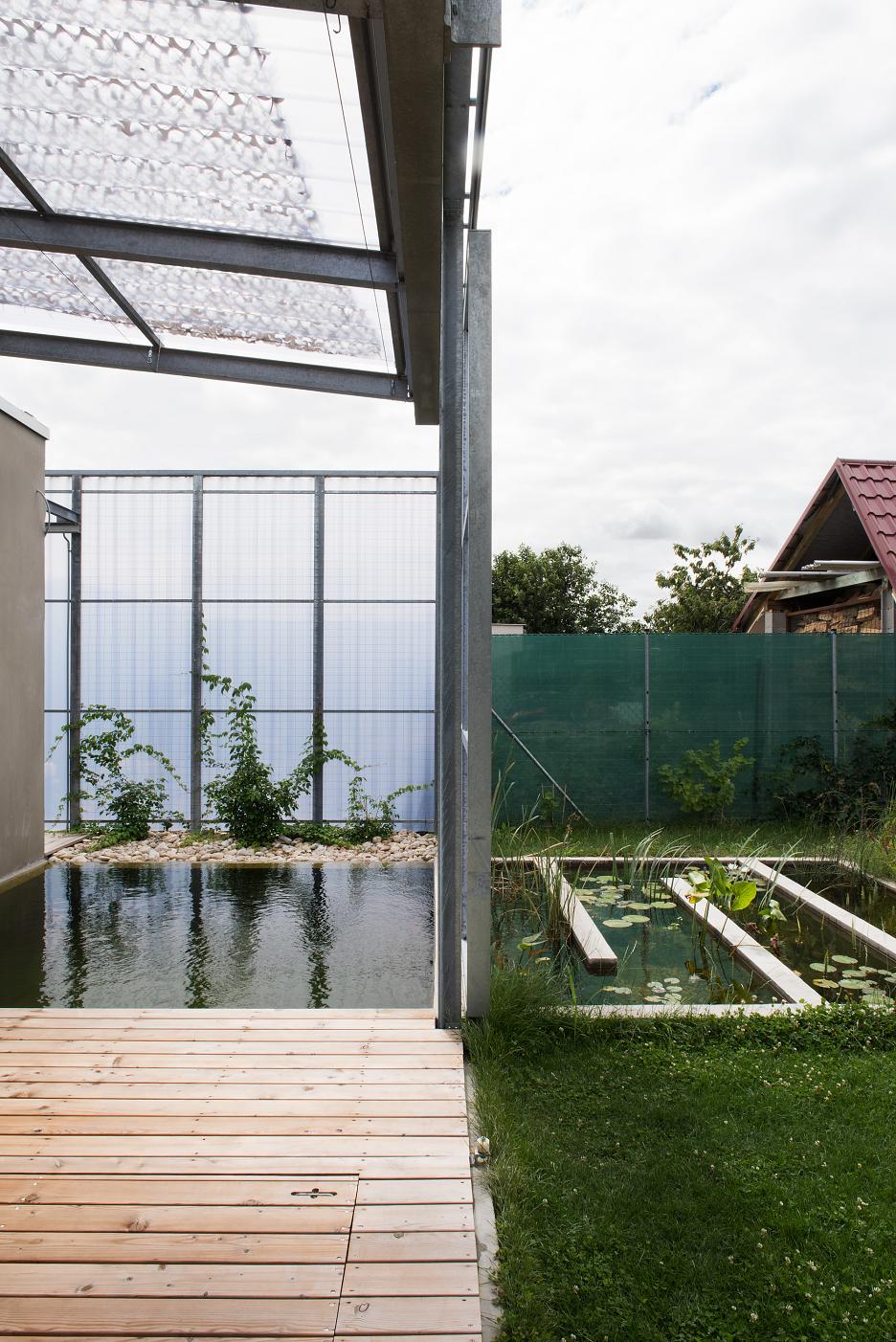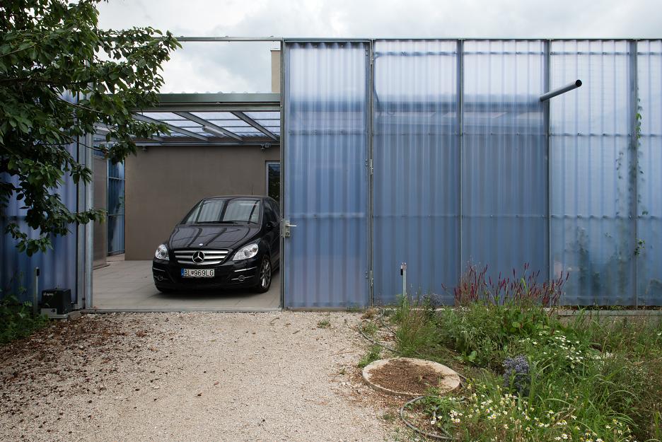 Samotný dom je rozdelený do dvoch sústredných častí – vnútornej a vonkajšej. Vnútorná pozostáva z nevyhnutných obytných miestností v pôdoryse Palladiánskej mriežky 3×3 polia s vertikálne akcentovanou jedálňou v jej centre. Vonkajšiu časť domu vypĺňujú doplnkové funkcie, ktoré nevyžadujú celoročné alebo permanentné využitie – pátiá rôznych veľkostí a proporcií, garáž, bazén a skladové priestory. Táto časť je akýmsi medzipriestorom, nie je ani domom, ani záhradou. Je ich mediátorom.