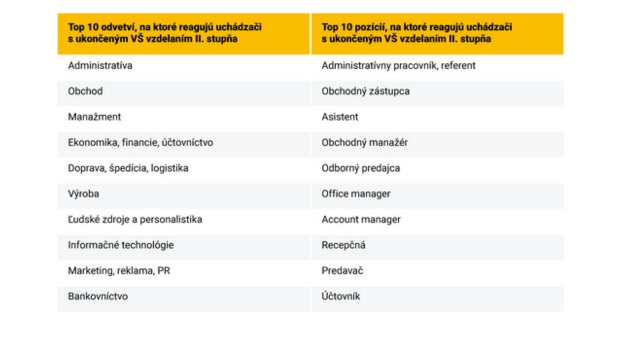 V prvej desiatke sa nachádza aj marketing, reklama a PR, ľudské zdroje či IT, no na tieto odvetvia už reaguje menej ako 5 % uchádzačov. Keď sa pozrieme na konkrétne pracovné pozície, najväčší záujem je o administratívne a obchodné pozície. To potvrdzuje teóriu, že ľudia s vysokoškolským titulom najviac reagujú na pozície, na ktoré postačí aj stredoškolské vzdelanie.