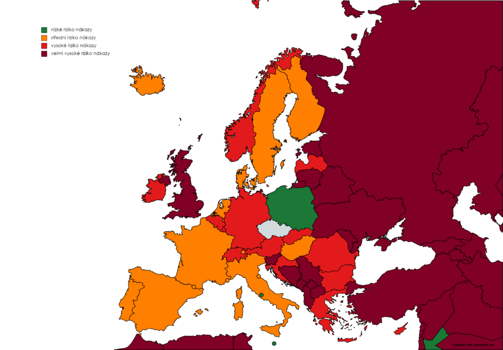 Český zoznam sa riadi dostupnými dátami od Európskeho centra pre prevenciu a kontrolu chorôb (ECDC). Spolu so Slovenskom sa do červenej farby presúva aj Luxembursko. V tejto kategórii sú zaradené aj krajiny ako Nemecko, Rakúsko, Rumunsko, Chorvátsko alebo Grécko.