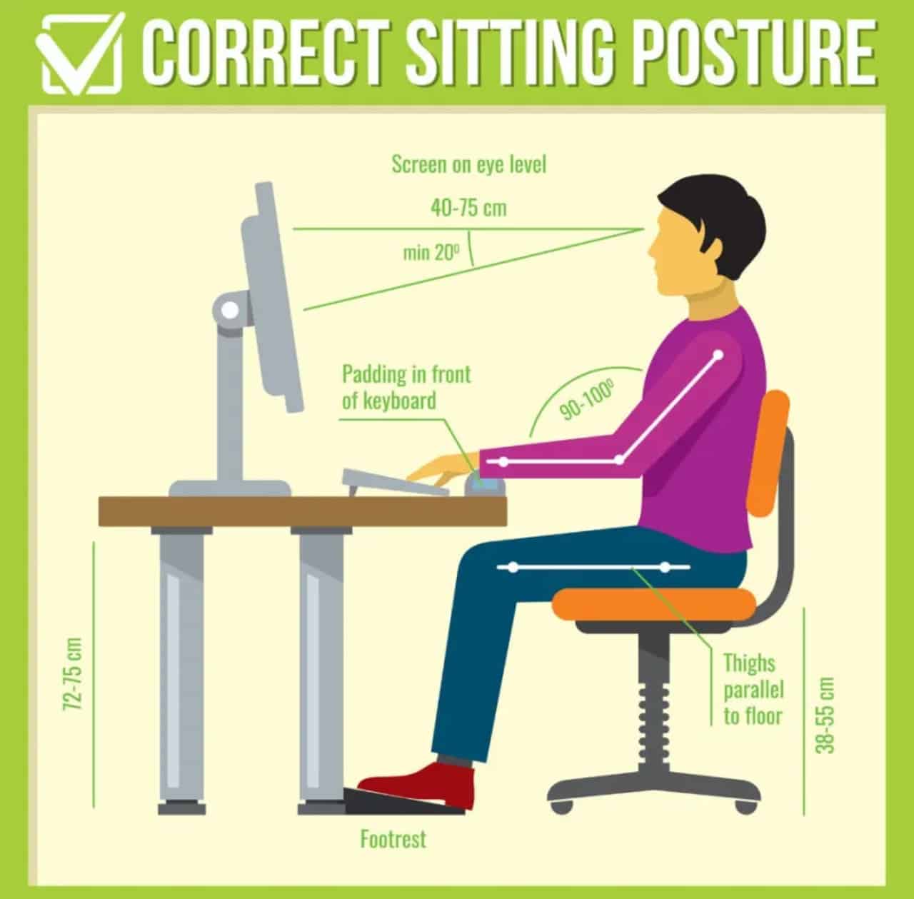 Medzi zákolenou jamkou a sedákom musí byť priestor na šírku päste. Kolenné, bedrové aj lakťové kĺby by mali byť vo viac ako 90- stupňovom uhle. Výška monitora by mala byť nastavená tak, aby ste pozerali do prvej tretiny obrazovky. Klávesnica počítača by mala byť 10 – 15 cm pred telom. Pre správne postavenie zápästia je vhodné používať opierky pre dlane.