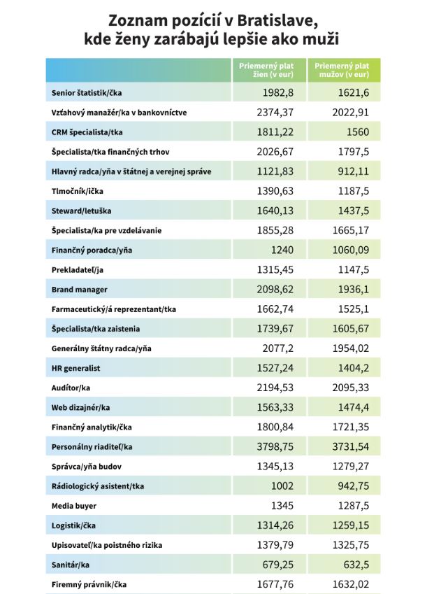 Najvýraznejší platový rozdiel vidieť pri pozícii senior štatističky. V Bratislave zarobí žena s týmto profesným statusom v hrubom 1 983 eur, zatiaľ čo hrubá mužská mzda na rovnakej pozícii dosahuje 1 621 eur. Rozdiely tiež uvidíš pri firemných právničkách, masérkach, letuškách, špecialistkách finančných trhov či brand manažérkach.