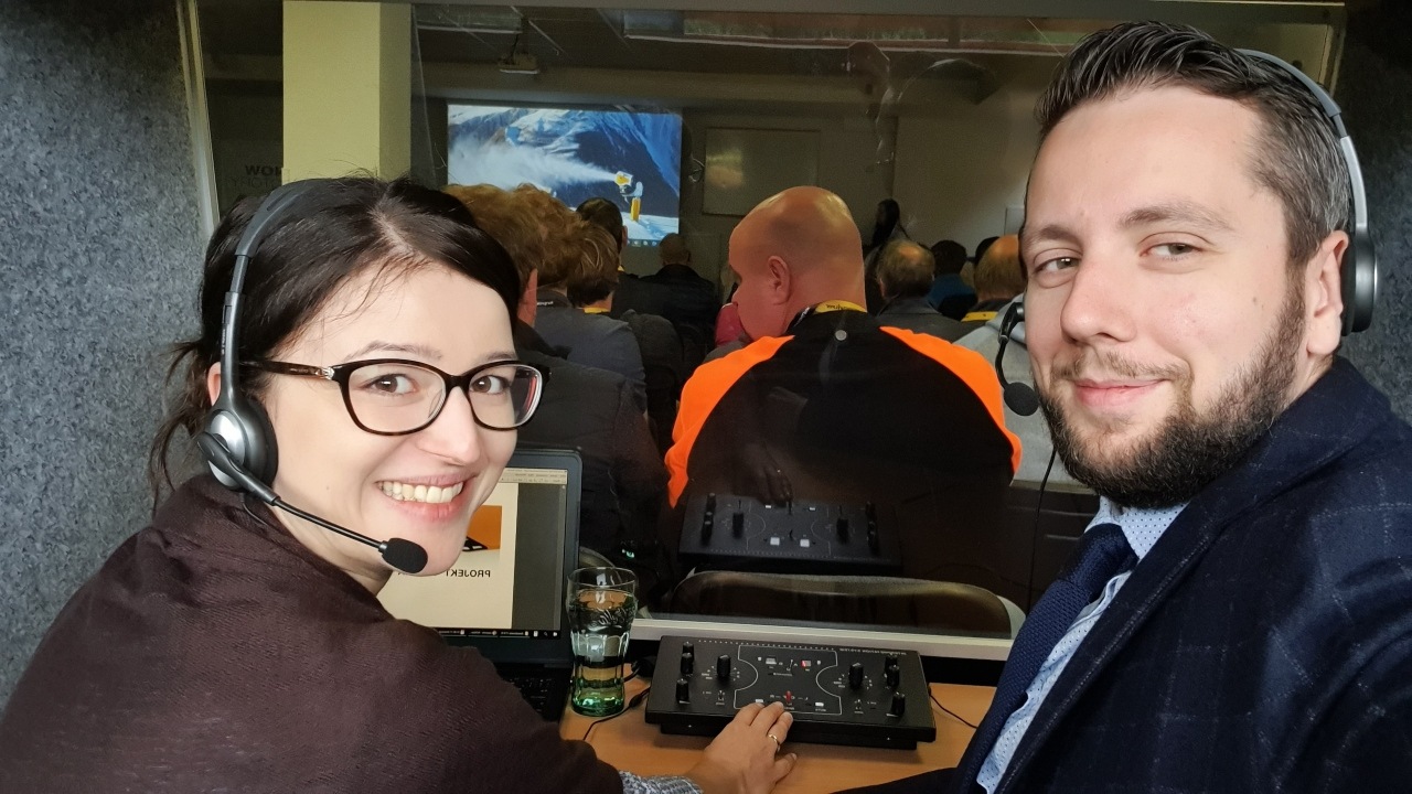 V tlmočníckej kabíne to väčšinou vyzerá veľmi príjemne, pretože – ako som spomínal – pracujem so super kolegyňami, a atmosféra býva skvelá. A vlastne neviem, či viete, ale v kabíne sedia obyčajne dvaja tlmočníci (v európskych inštitúciách dokonca traja). Skúste si zapnúť televízne noviny, a začnite si ich pošepky tlmočiť do cudzieho jazyka, ktorý ovládate. Po pár minútach si zrejme poviete, že už by aj stačilo. A práve preto sú v kabíne dvaja tlmočníci. Samozrejme, že sa nestriedame po pár minútach, v závislosti od náročnosti témy sa zvykneme vymeniť po 15 – 30 minútach, je to na dohode. Takto má príjemca „v uchu“ vždy čerstvý, oddýchnutý hlas.