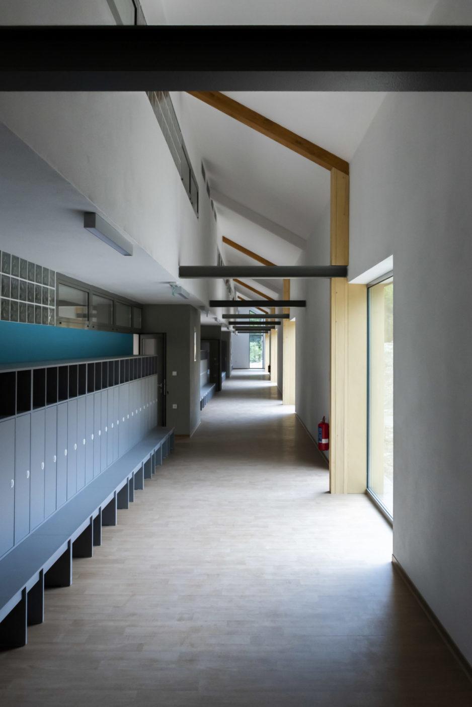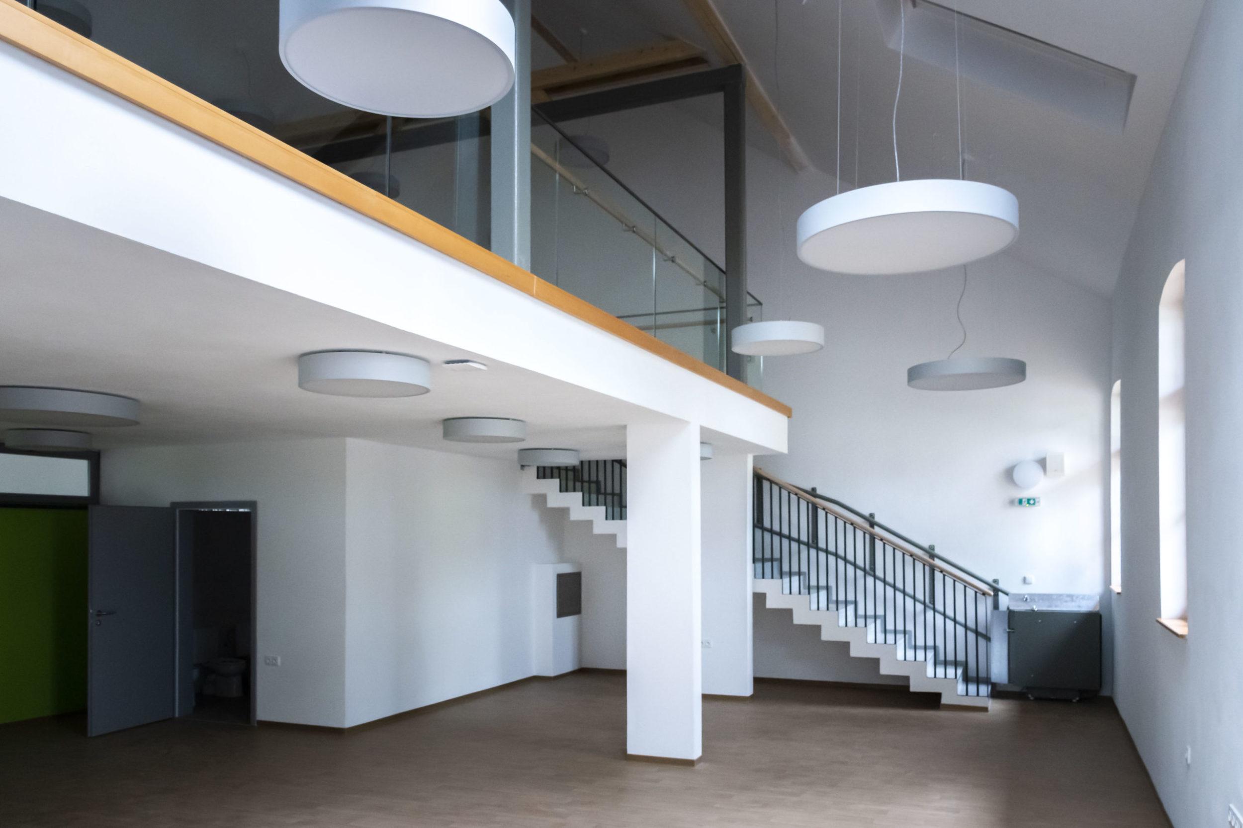 Spálne sú logicky umiestnené na poschodí. Novú budovu architekt poňal s titánovo-zinkovou fasádou a veľkými presklenými stenami smerovanými do átria. V celej budove je laminátová podlaha s podlahovým kúrením. Projektová dokumentácia veľmi citlivo vyriešila celý interiér s kuchyňou a jedálňou.