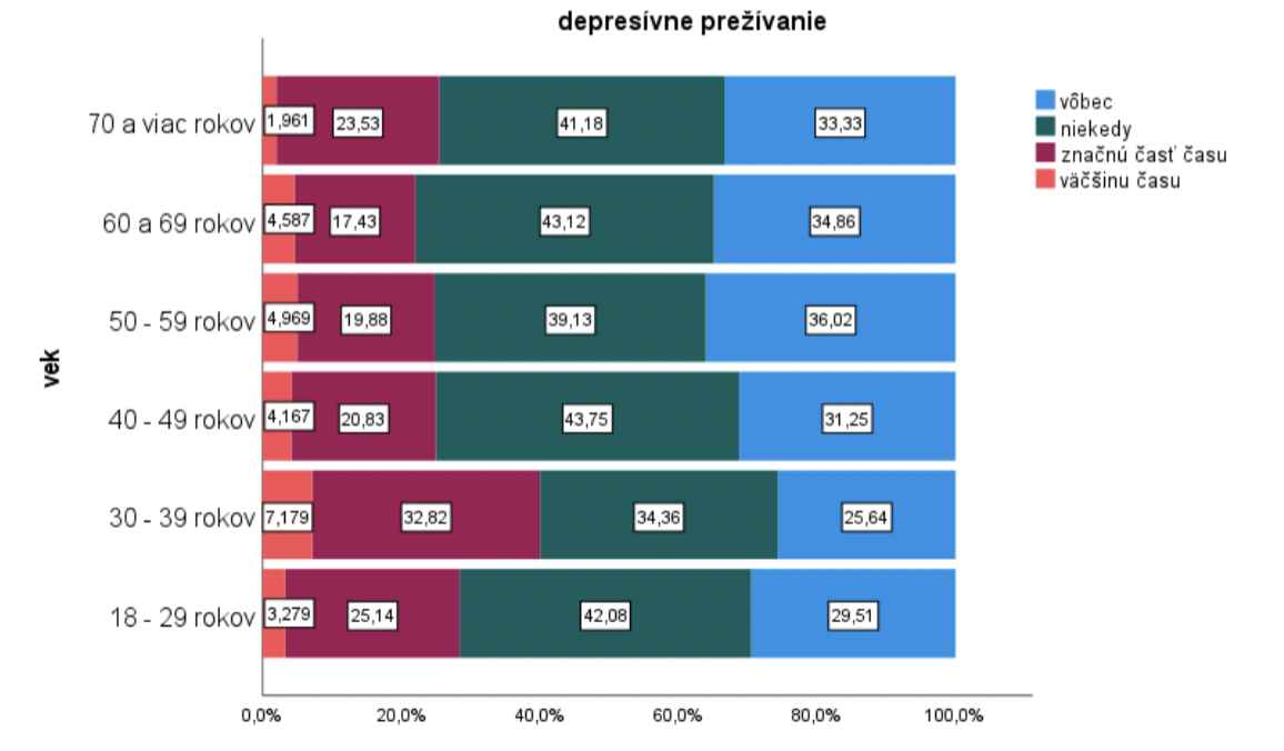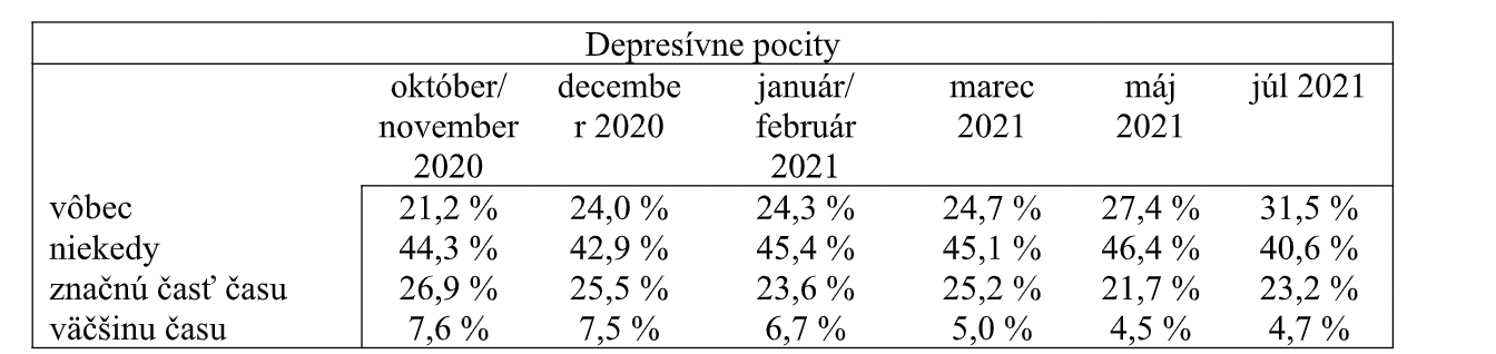 Výskumníci pozorovali Slovákov a Slovenky od Novembra 2020. Namerané dáta ukázali, že depresívne pocity kontinuálne klesajú. Zatiaľ čo v Novembri iba pätina respondentov nepociťovala depresívne pocity (21,2 %), v júli to už bola skoro tretina (31,5 %). Spoločne s nimi klesá aj počet tých respondentov, ktorí odpovedali, že zažívajú depresívne pocity väčšinu času.