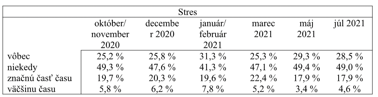 „Kým v miere depresívneho prežívania sledujeme výrazný pokles, miera zažívaného stresu klesá oveľa pomalšie a predpokladáme, že súvisí i s inými osobnými, pracovnými či spoločenskými udalosťami na Slovensku,“ konštatuje Kamila Urban z Ústavu výskumu sociálnej komunikácie SAV.