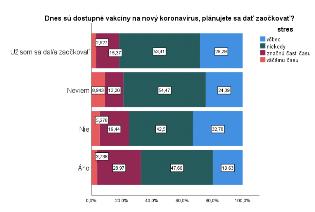 Rovnako ako depresívne pocity, aj prežívaný stres sa líši u zaočkovaných a nezaočkovaných respondentov. Stres väčšinu času zažívalo až 9 % ľudí, ktorí ešte nie sú rozhodnutí, či sa dajú zaočkovať. Iba 3% zaočkovaných respondentov odpovedalo, že pociťuje stres väčšinu času. U rozhodnutých nezaočkovaných to bolo 5,3 % ľudí. Dáta teda ukázali, že tí, ktorí nevedia, či sa dajú zaočkovať, prežívajú stres najčastejšie.