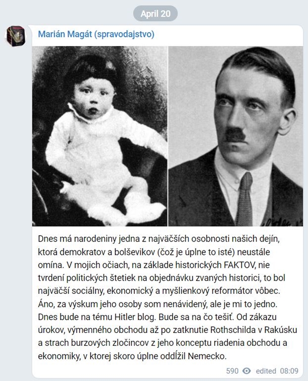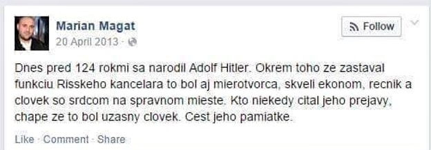 „Úžasný človek, mierotvorca, človek so srdcom, najväčšia osobnosť…,“ tak zvykol o Adolfovi Hitlerovi písať Marián Magát.