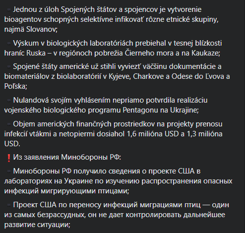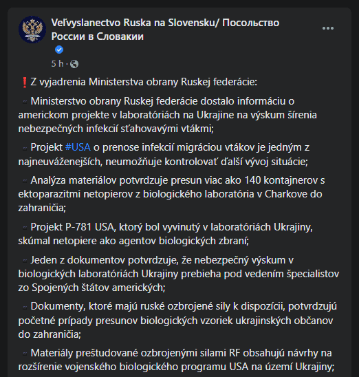 Jednou z úloh Spojených štátov a spojencov je vytvorenie bioagentov schopných selektívne infikovať rôzne etnické skupiny, najmä Slovanov,“ uvádza veľvyslanectvo Ruska na Slovensku na sociálnej sieti v slovenčine aj ruštine. Veľvyslanectvo však dodáva, že Spojené štáty už stihli vyviezť väčšinu dokumentácie a biomateriálov z laboratórií.