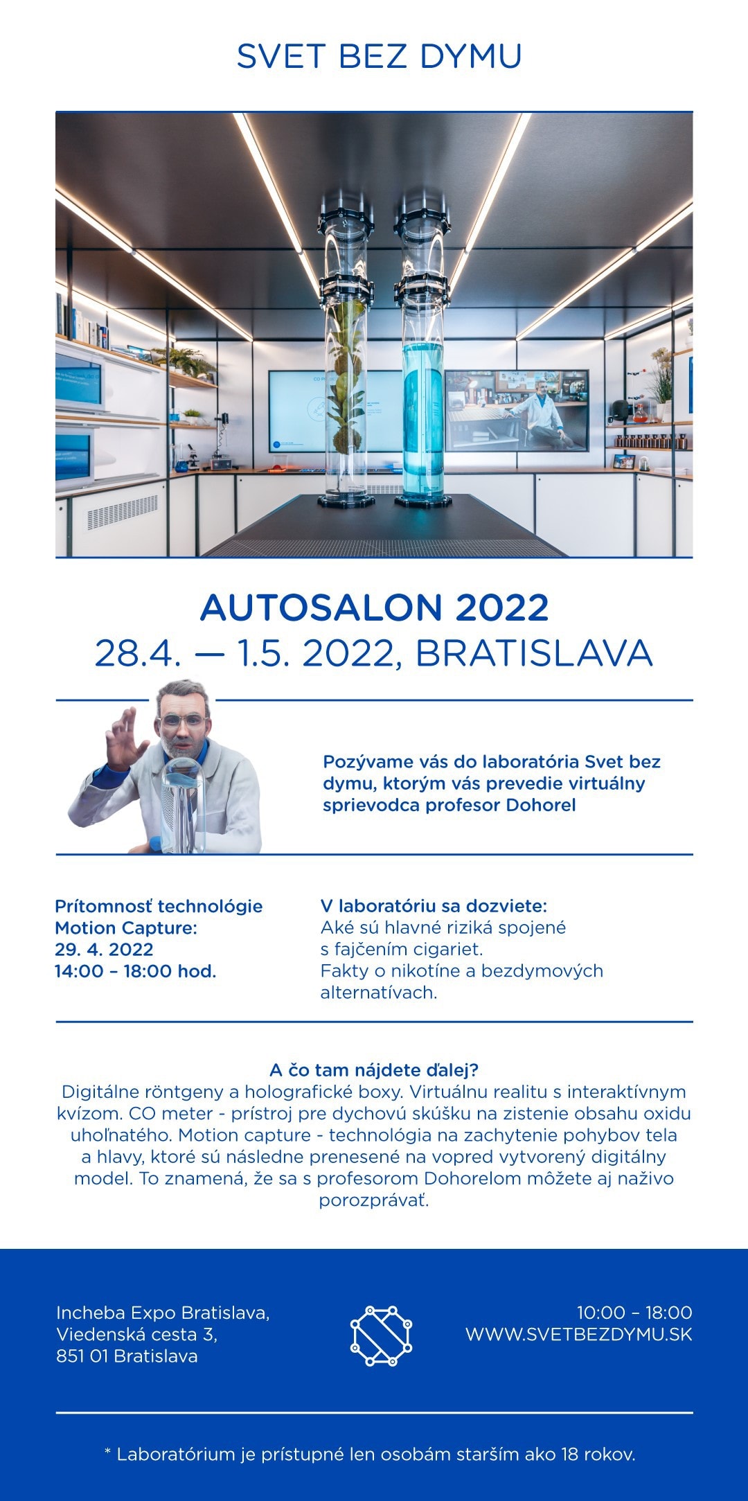 Všetci milovníci nielen rýchlych a luxusných áut sa čoskoro stretnú na výstavisku Incheba Expo Bratislava. Na svoje si prídu aj nadšenci pre vedu a výskum. Spoločnosť Philip Morris od 28. apríla do 1.mája 2022 prináša interaktívne laboratórium „SVET BEZ DYMU“ pred Incheba Expo Bratislava. Jeho cieľom je priblížiť dospelým fajčiarom a ich blízkym vedecké zaujímavosti, ktoré stoja za modernými bezdymovými nikotínovými alternatívami. Sprievodcom iniciatívy bude virtuálny profesor Dohorel, s ktorým sa návštevníci laboratória budú môcť porozprávať.