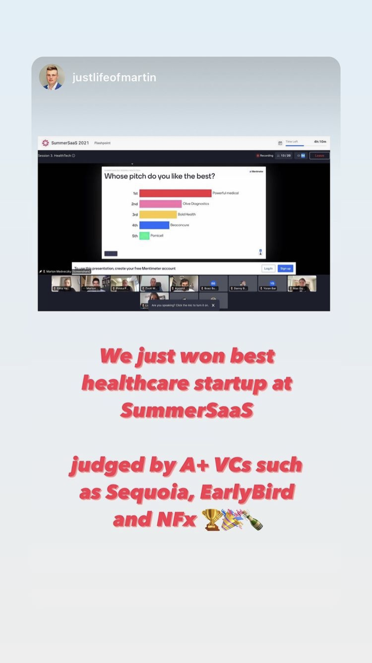 V kategórii Health Tech dokázala slovenská spoločnosť Powerful Medical vyhrať nad štyrmi ďalšími najsilnejšími startupmi v oblasti zdravotníckych technológií z celej Európy a Izraela. Slováci kategóriu vyhrali s veľkým náskokom, čo pre Startitup potvrdil Felix Bauer z tímu startupu.