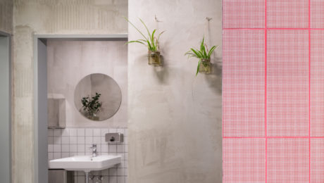 Po štvrté používanie priemyselných prvkov: kaučuková podlaha, priesvitné PVC závesy typické pre sklady a priznané rozvody.