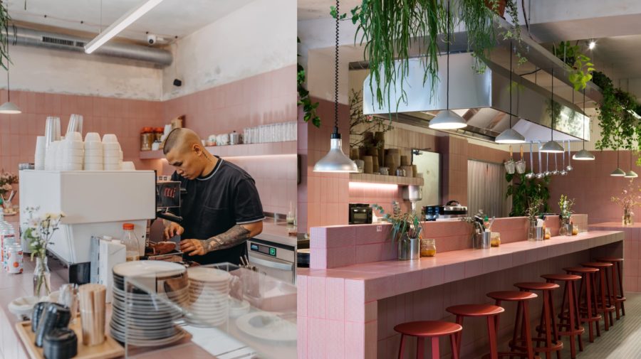 Okrem výrazných stoličiek pre hostí pozadie tvoria prirodzené odtiene šedej až bielej. Nájdeš tu oceľ gastrovýbavy či stolov pre hostí, oškrabané pôvodné steny, lepidlo, no aj náter na tvárniciach nových priečok a nechýba ani kaučuková podlaha.